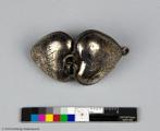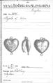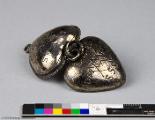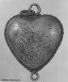 En öppningsbar amulett i hjärtform, repdekor runt om, försedd med öglor såväl upptill som nertill, graverat mönster: på ena sidan vapensköld med bokstäverna I V S ovanför, på andra sidan ett hjärta med två vinklar eller Vn ovanpå, ett E inuti, omgivet av bokstäver: till höger ES och till vänster DM. Ovanför hjärtat med vinklarna står E E E, under hjärtat står S S S.