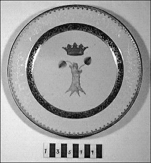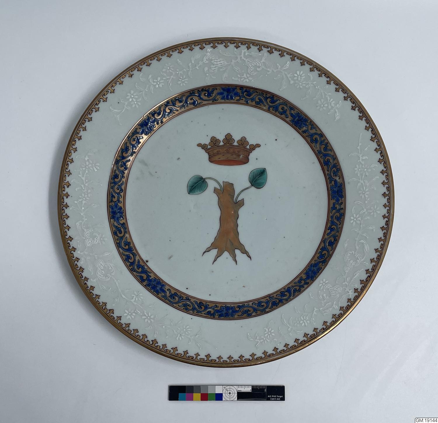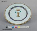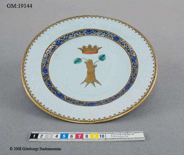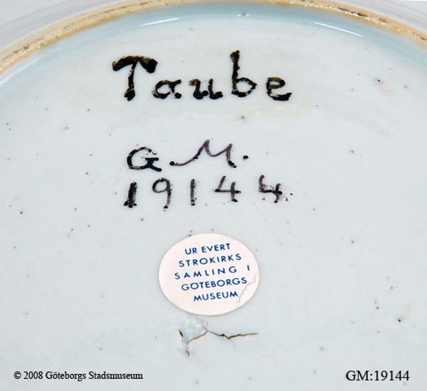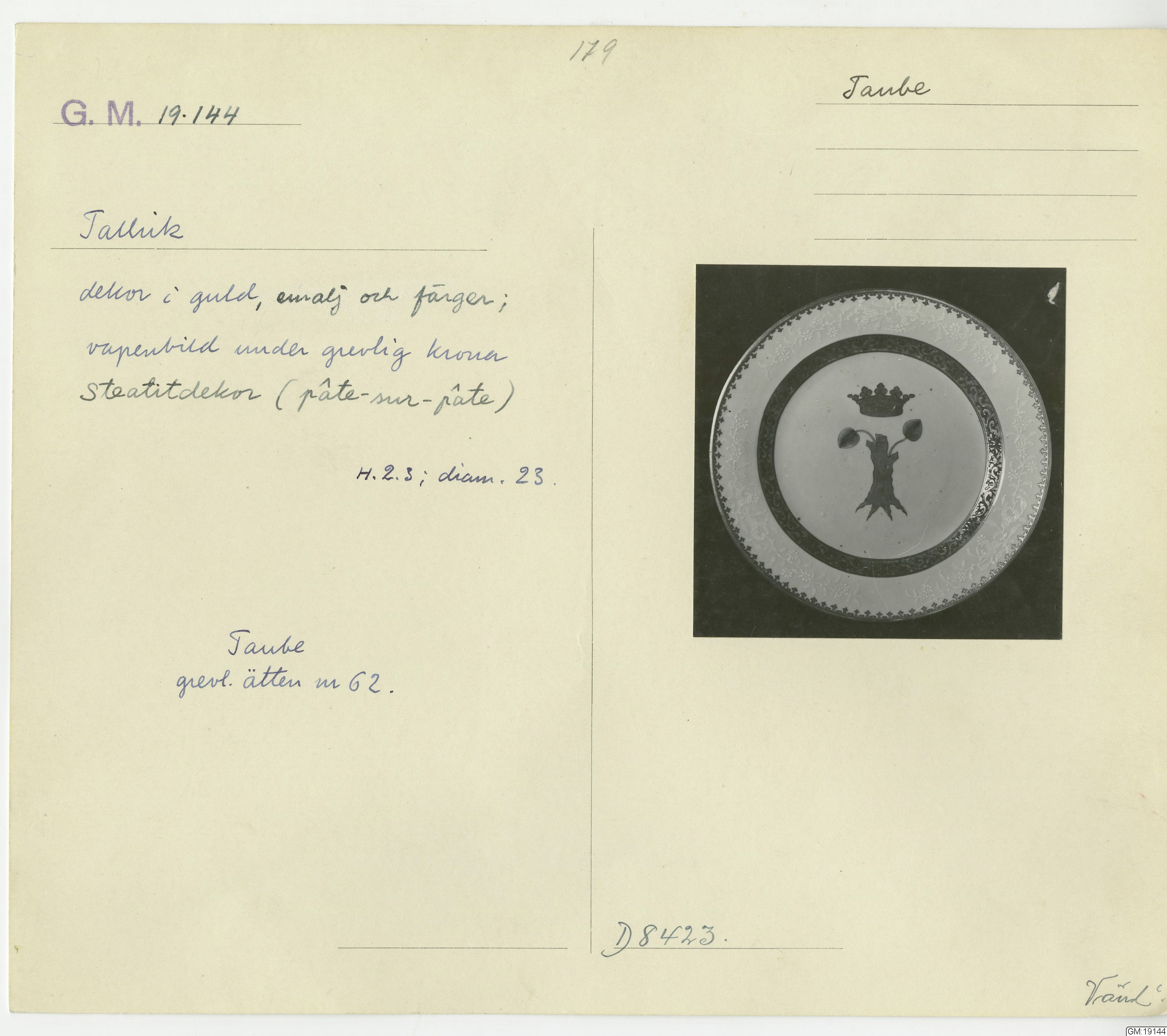 - Tallrik med vapen: Taube, guldfärgad mynningsbård, transparant blommönster och blå blomranka på guldbotten.