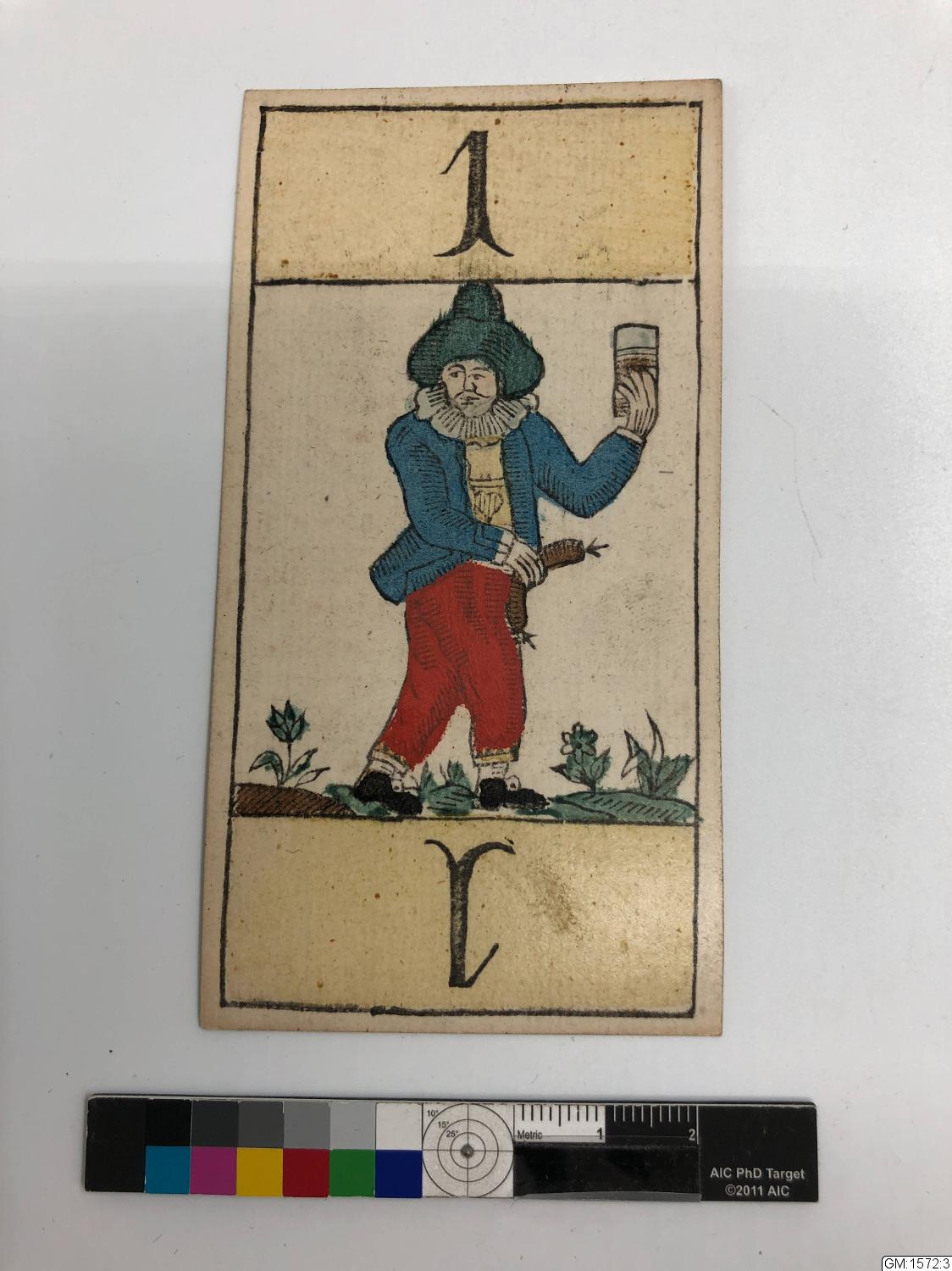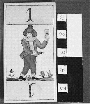 - :3 Tarock-kort. Föreställande en man i röda byxor, blå jacka och grön hatt. Han håller ett glas i vänstra handen och en korv i den högra. Kortet har nummer "1" skrivet över och under figuren. Kortet gjort i träsnitt och handkolorerat; schablonerade franska svitmärken. Mönster i ljusblå prickrosetter på baksidan. Ingen tillverkare angiven. Ingen hallstämpel.