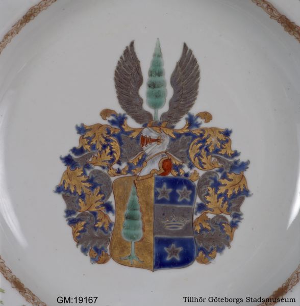 adliga ätten Cedercronas vapen [påmålat i svart färg undertill]; Ur Evert Strokirks samling i Göteborgs Museum [klistermärke undertill på tallriken]; adliga ätten Cedercronas vapen