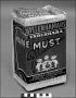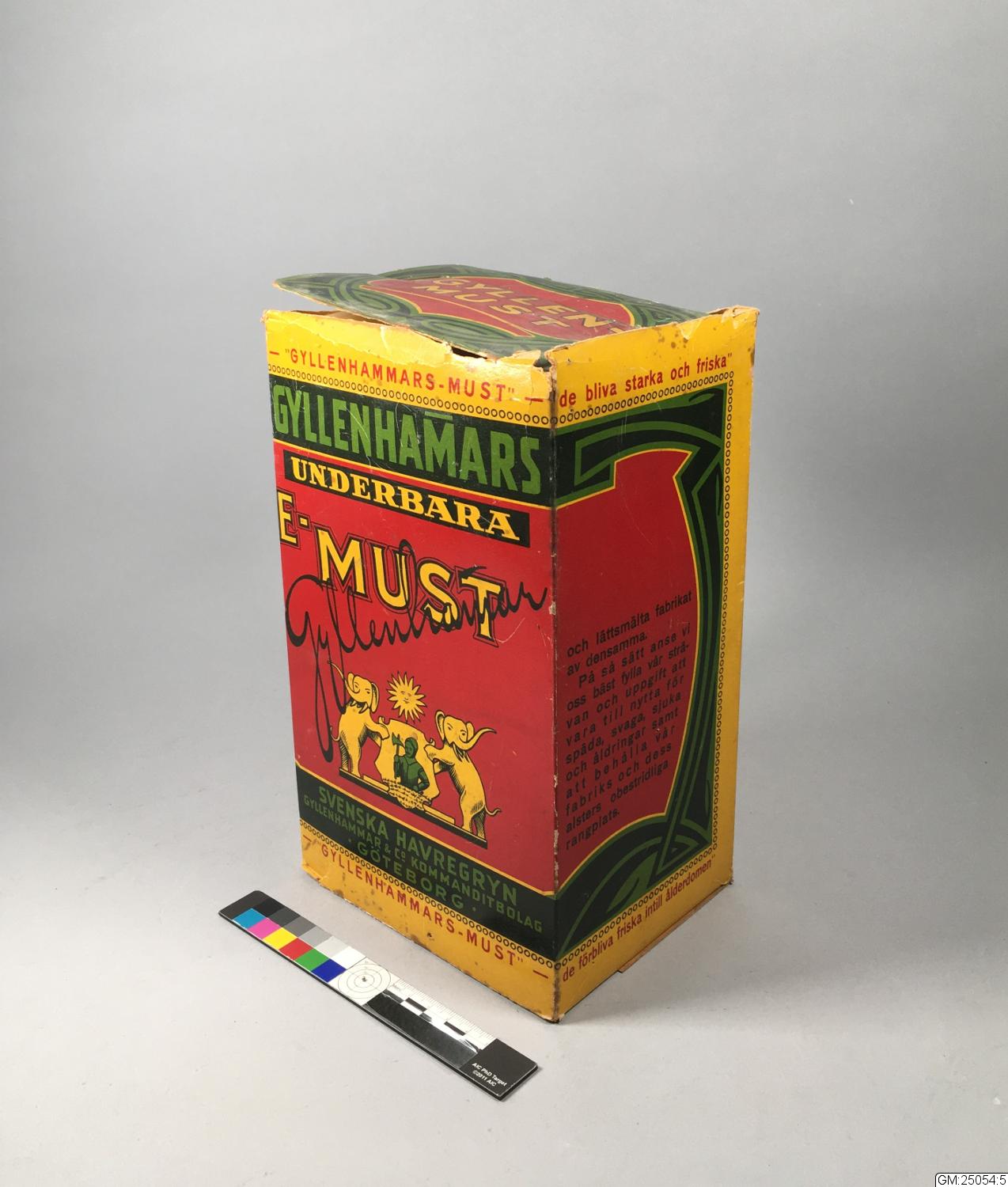 Material: papp metall#Teknik: tryckt#Kartong med tryck på gul botten, med fält, text mm i grönt svart och rött. Dekorativa slinor i i ramen och på locket, jugend. Runt kanten ett band med "pärlstav". På framsidan en vapensköld omgiven av två elefanter och kröns av en sol. Text med firma och produktnamn. På lock och botten "Gyllenmust" inom en jugendram i svart och grönt. På baksidan recept.#Kartongen tryckt hos Göteborgs Litografiska A-B. I hopsatt med häftklammer.#Locket och överkanten trasigt.