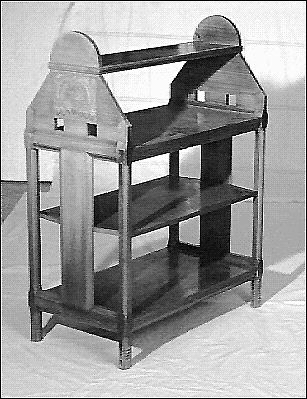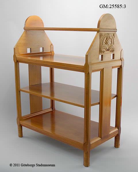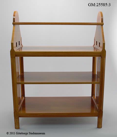 - Tidskriftsbord med fyra hyllor och två gavlar. Material troligtvis mahogny.Transparent ytbehandling som fluorescerar i orange och grönt. Gavlarna dekorerade med sniderier. Stämpel under ett hyllplan "A.B. Nordiska Kompaniet, Kungl Hovleverantör, Stockholm".