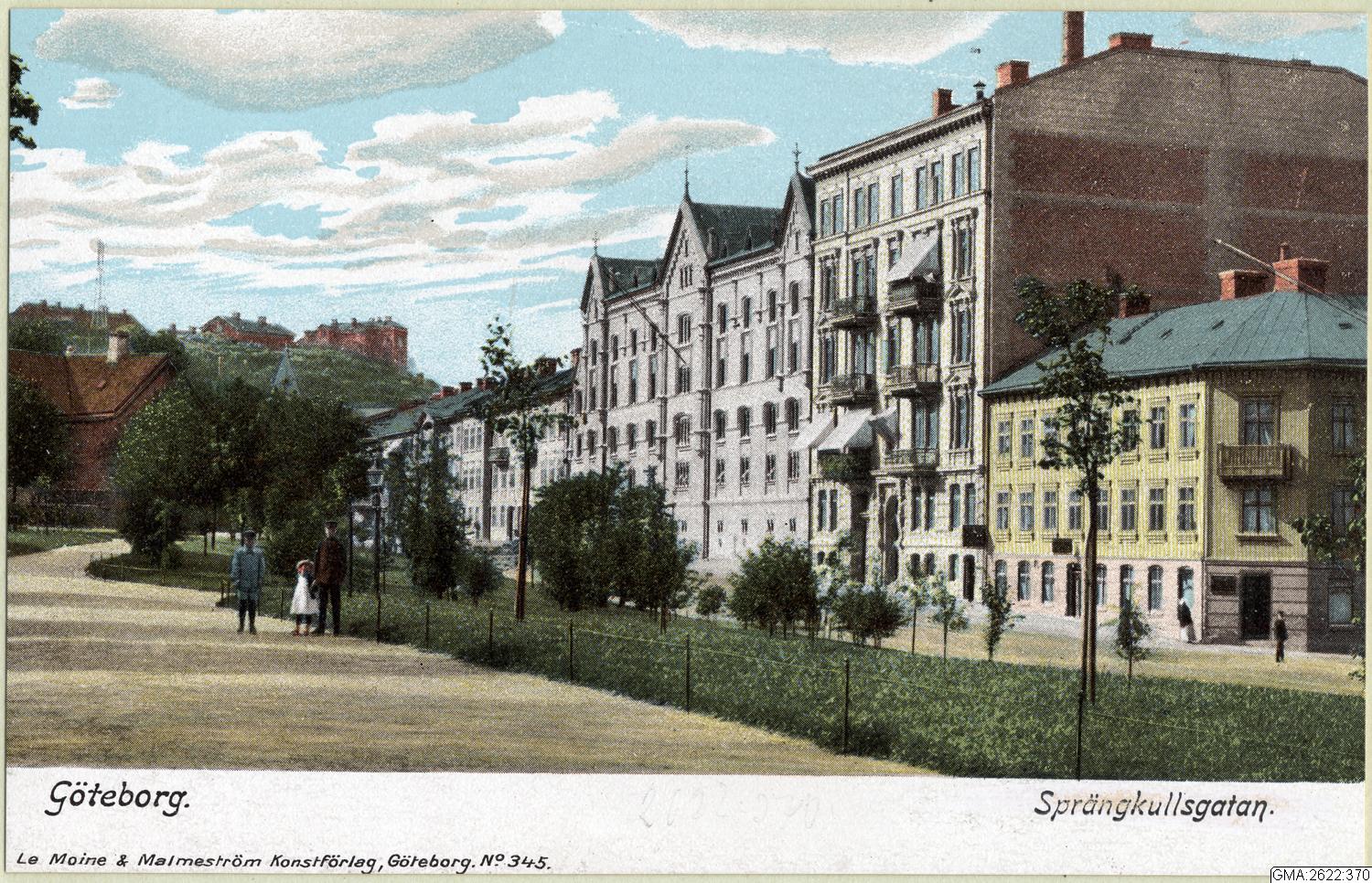Bilden visar västra sidan av Haga Kyrkoplan och till höger Sprängkullsgatan med Münchenbryggeriet på nr 19..