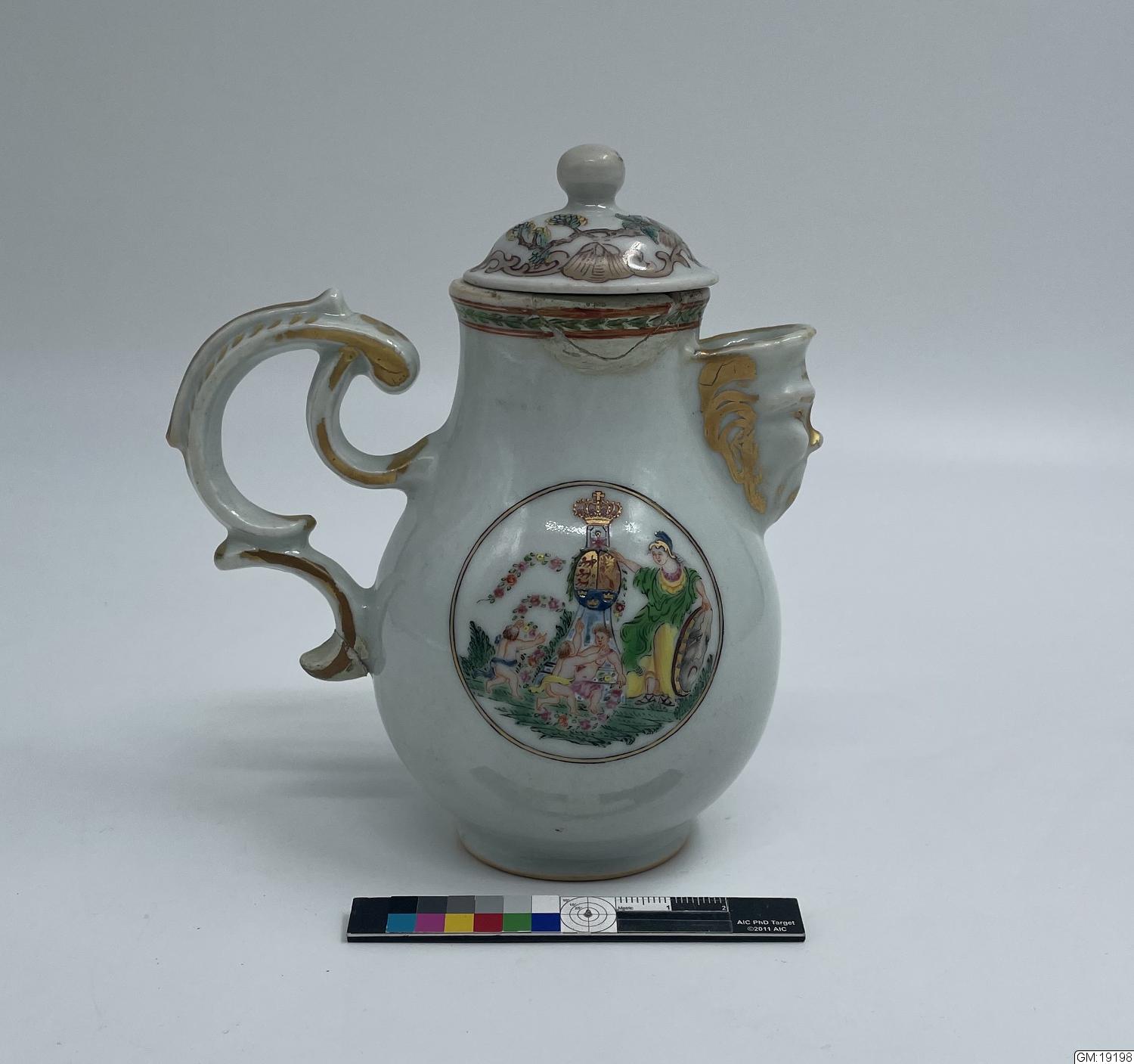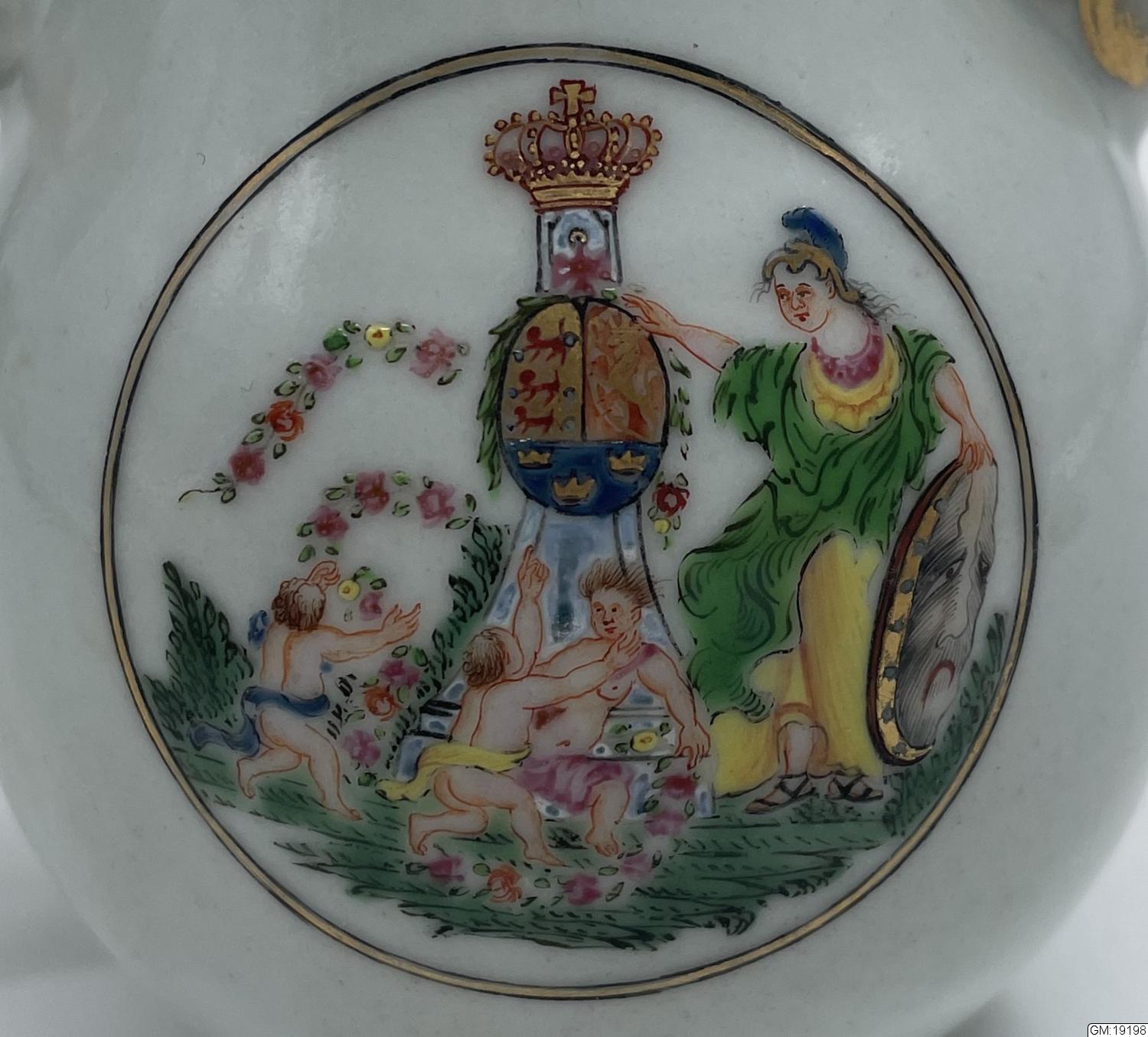 Utförd efter 1782 i Kongens Klub i Köpenhamn (stiftad 1776). Är omnämnd i boken Dansk Ostindisk Porcelaen, s. 64 av Bredo L. Grandjean.