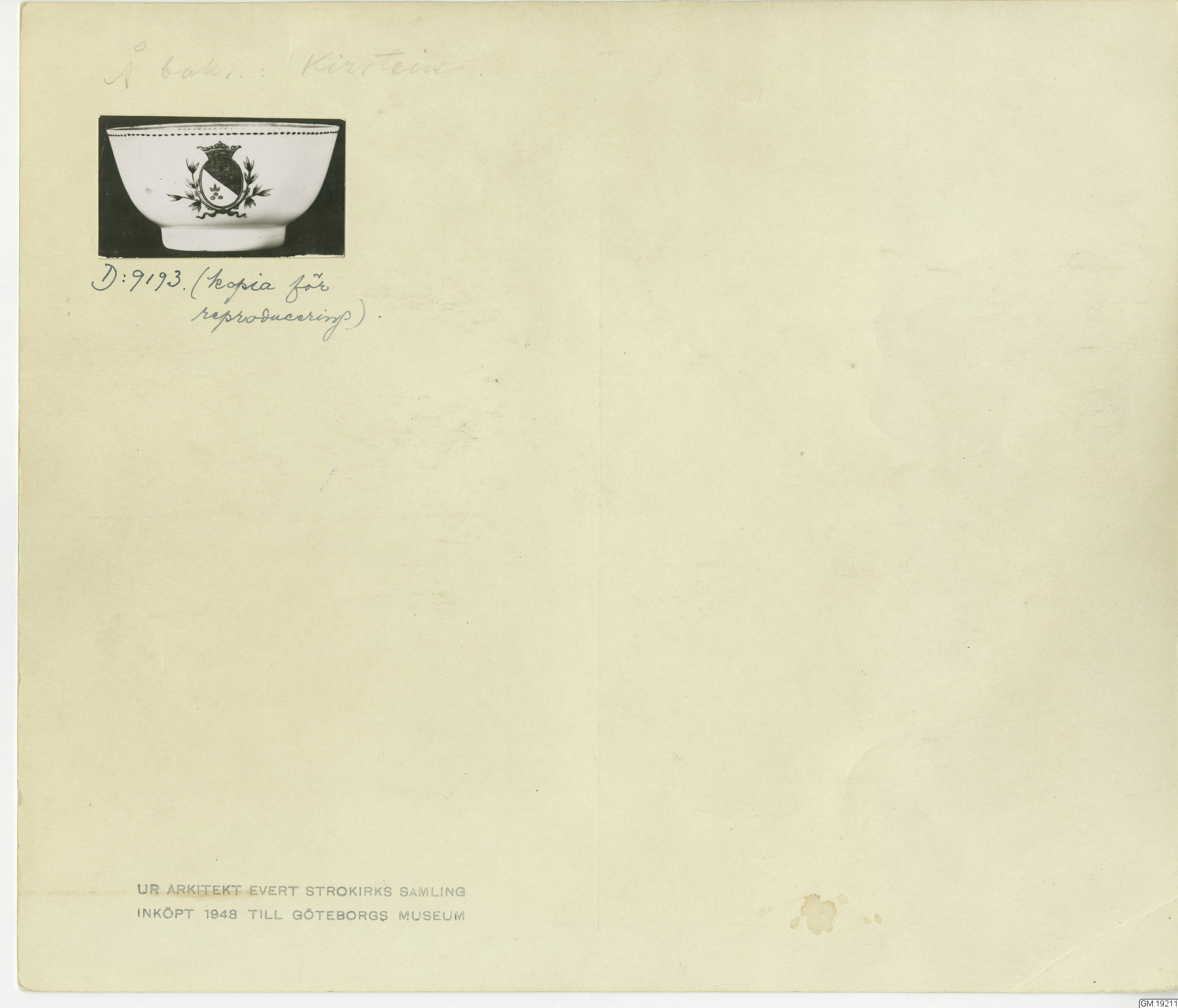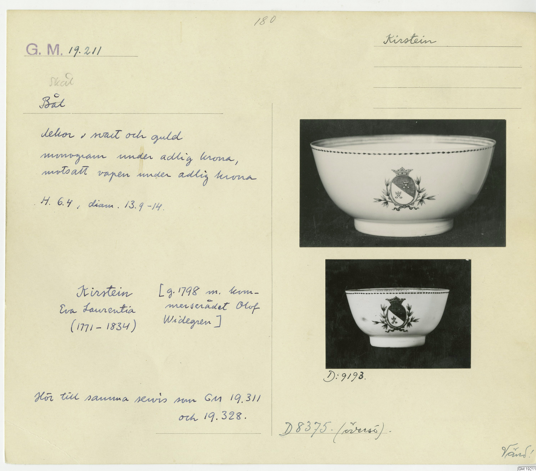 - Föremålen bär monogrammet ELK vilket kan tolkas som Eva Laurentia Kirstein (1771-1834) och var gift 1798 med kommersrådet Olof Widegren i hans 2:a gifte.