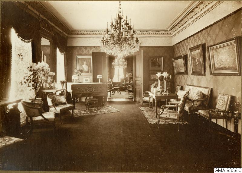 Bilden ur album från Emil Haglunds hem. Interiörbild med bord med 2 karmstolar, soffa och bord, blandat gustavianskt och nygustavianskt möblemang, stor takkrona, flygel och stor blomkruka vid förnstret. Fotot visar samma rum som GMA:9338:5. Fotot visar också ytterligare rum i fil.