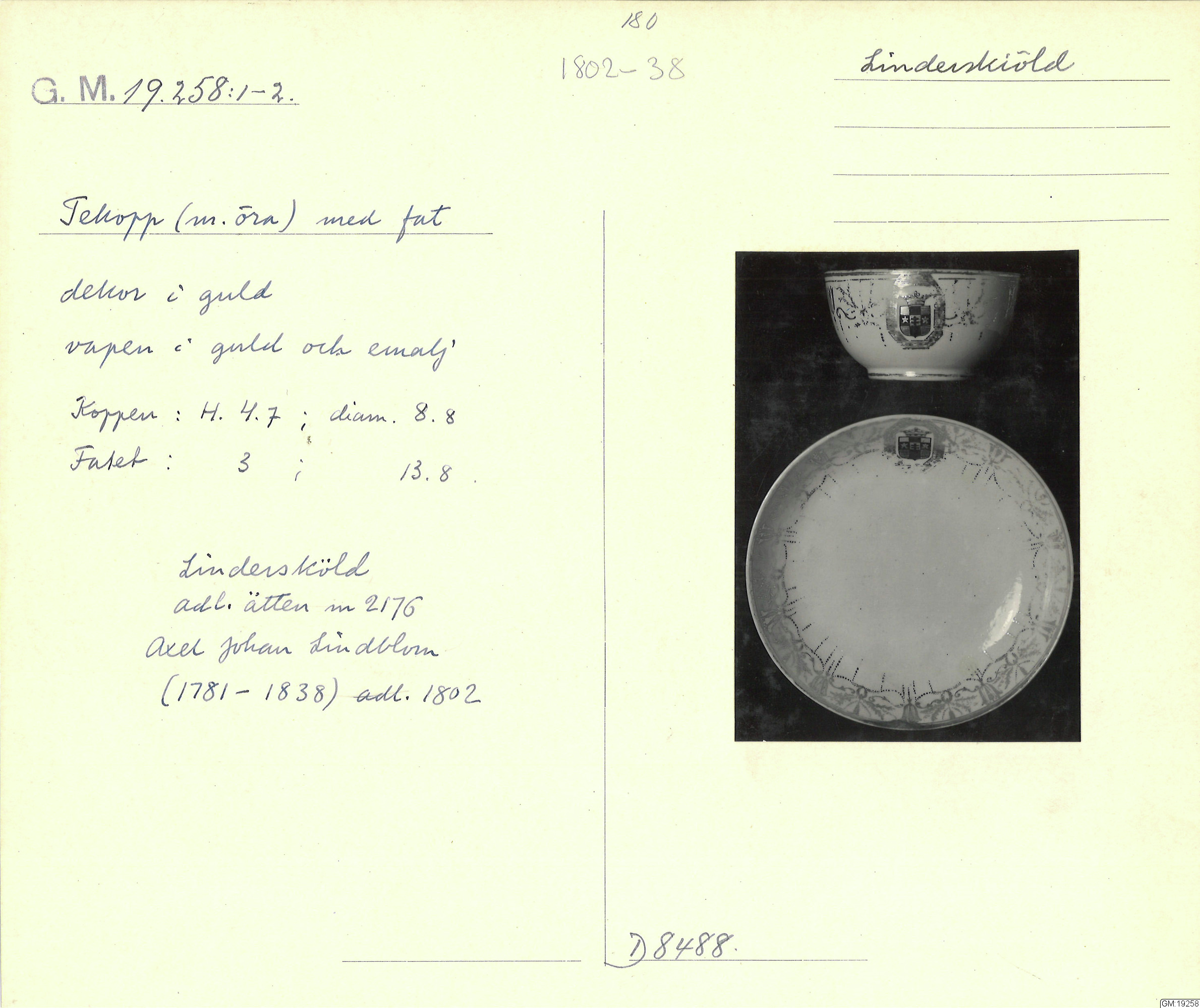 Ostindiskt porslin som beställdes av biskop Jakob Axelsson Lindblom till någon av sina söner vilka adlades för faderns förtjänster år 1802. Porslinet kom hem med skeppet Östergötland till Sverige.