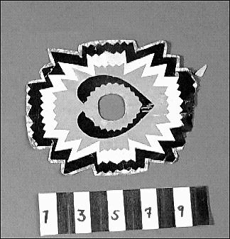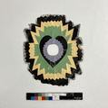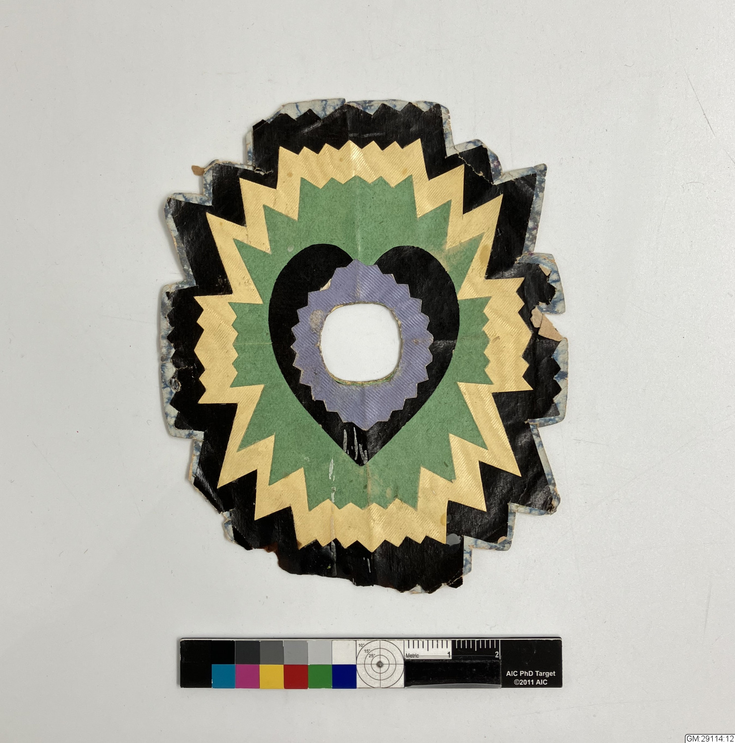 Julgransprydnad av glanspapper klippt i många lager och former med taggig kant. Färger från ytterkant till mitten; gråblå-vit mönstrat, svart, gul, ljusgrön, svart och lila, med hål i mitten att trä på julgranens grenar.