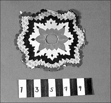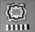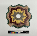 Julgransprydnad av glanspapper klippt i många lager och former. Fyrkantig med taggig kant. Färger från kant till mitten; olivgrön, lila-vit mönstrat, violett, gult och silver, med hål i mitten att trä på julgranens grenar.