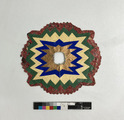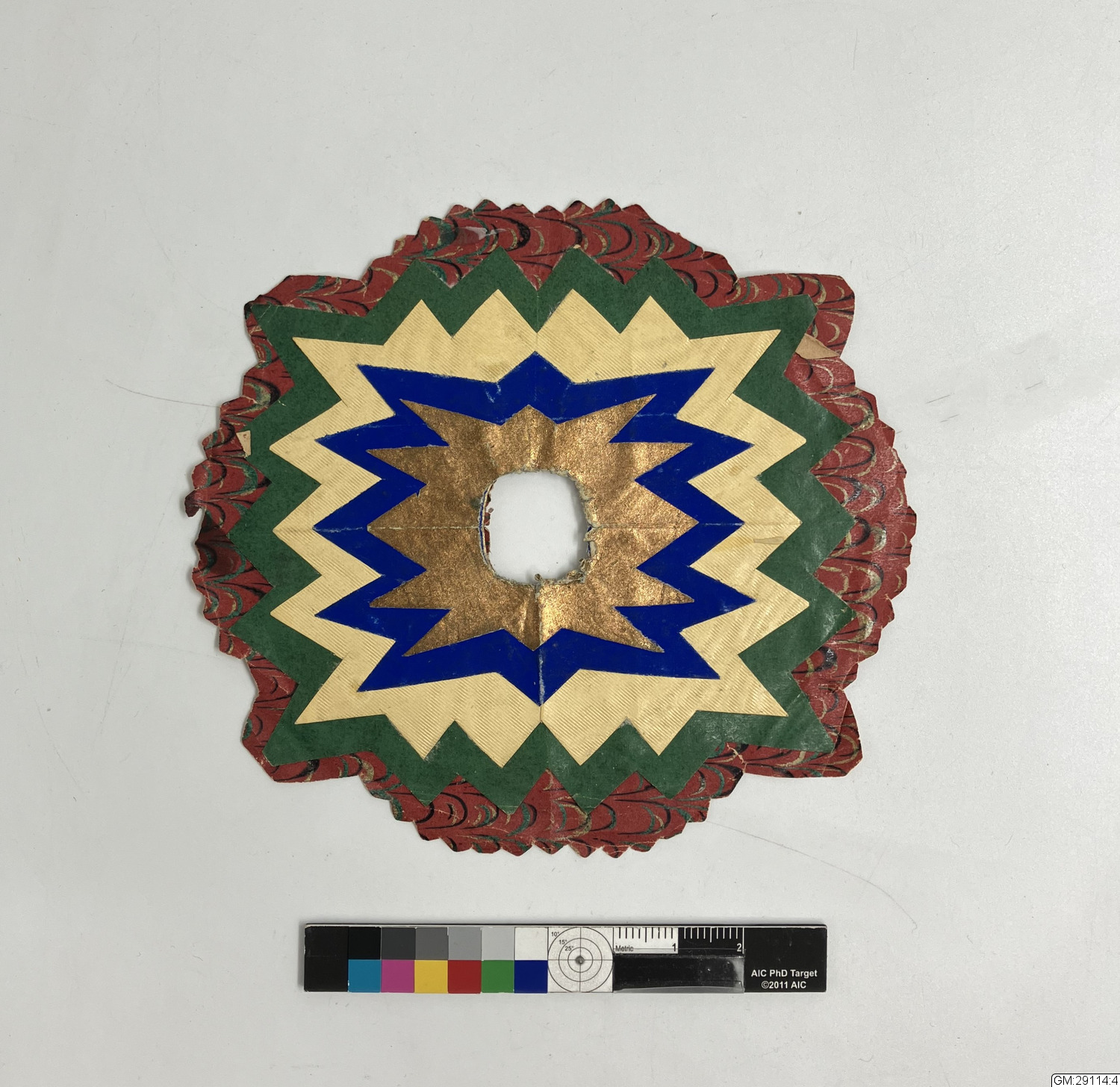 - Julgransprydnad av glanspapper klippt i många lager och former med vågig kant. Rund. Färger från ytterkant till mitten; röd grön, vit, klarblå samt guld, med hål i mitten att trä på julgranens grenar.
