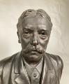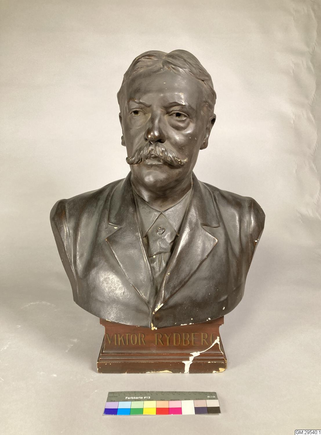 "Byst förest. Viktor Rydberg (1828-1895) vid H. T: 1856-1876, av gips. H. 60 cm, Br. 50 cm. Bröstbild på rektangulär sockel. Realistisk, något stiliseerad framställn. av V.R. i kostym m. kravatt, mustasch etc. Kopia efter original ..." av Per Hasselberg 1892