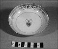 Fat (jfr kopp GM 19 291), vitt porslin med dekor i guld vapen för Puke med devis "Ihärdig och pålitelig". Guldbård med blad runt brätte