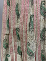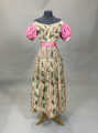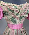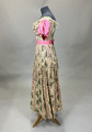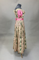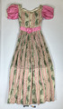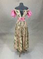 - Från katalogkort: Klänning. Voile (?), vit botten med tryckta och invävda mönster i grönt, svart och rosa. Längd liv fram:25 cm, bak: 25 cm, längd kjol fram: 90 cm, bak: 90 cm, kjol, vidd: 230 cm.
