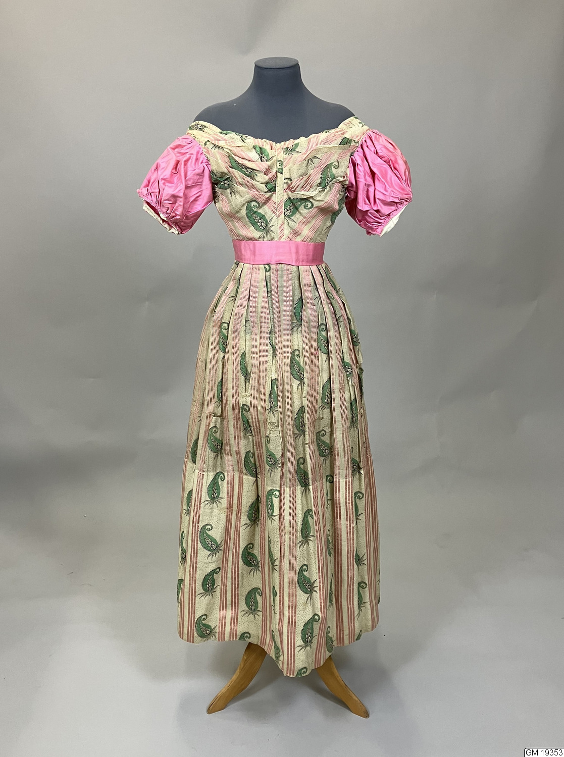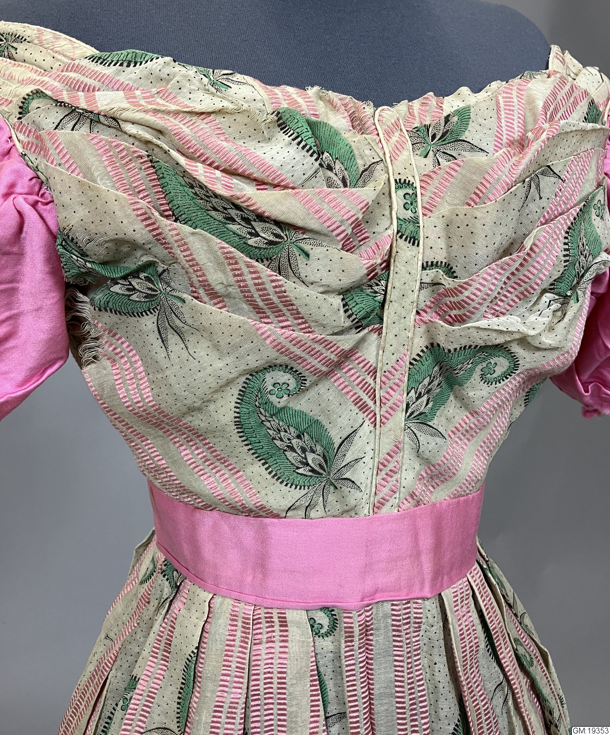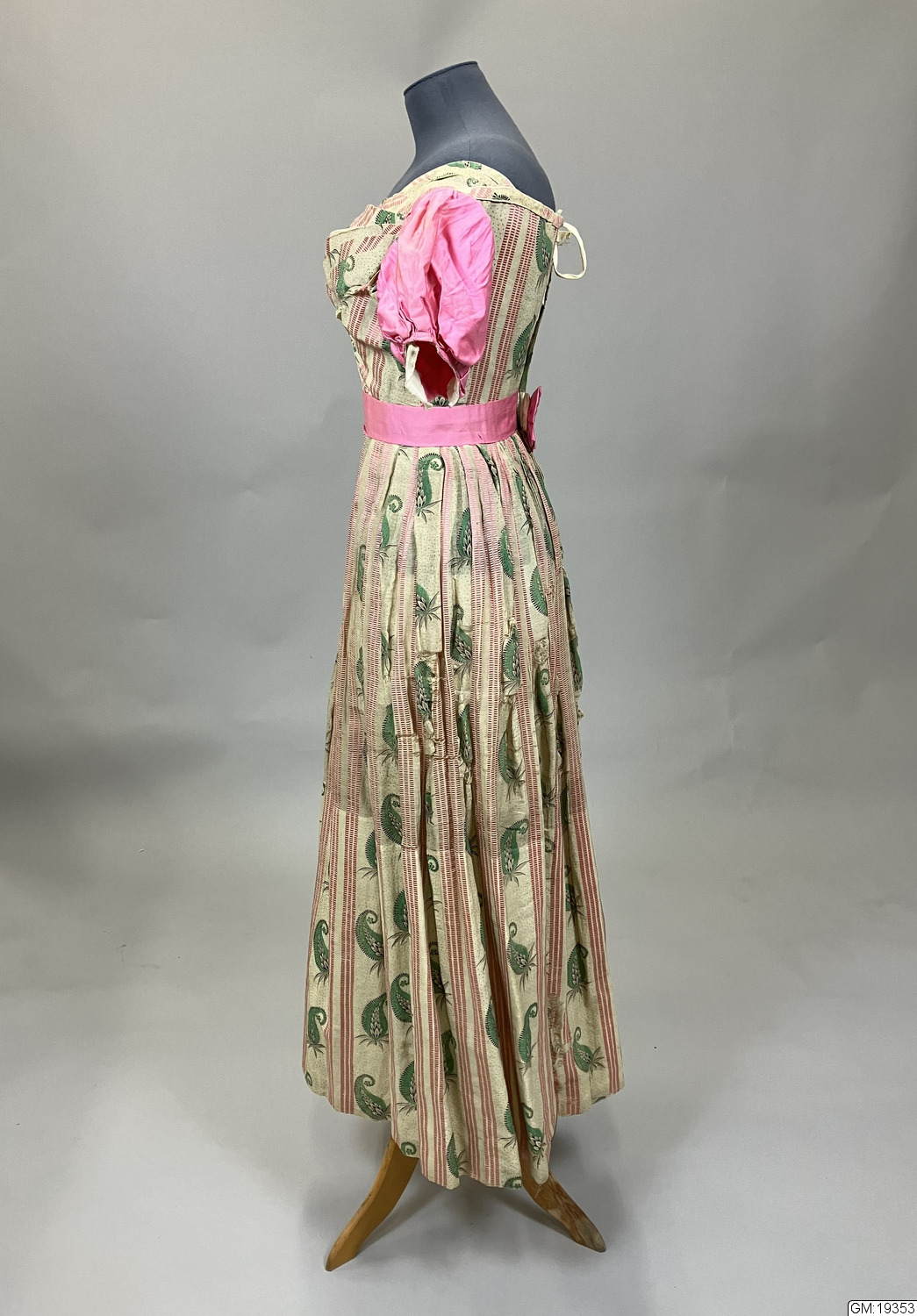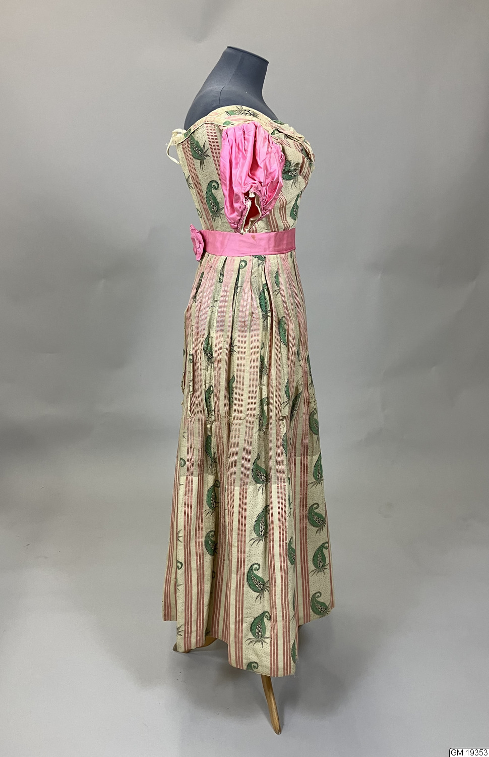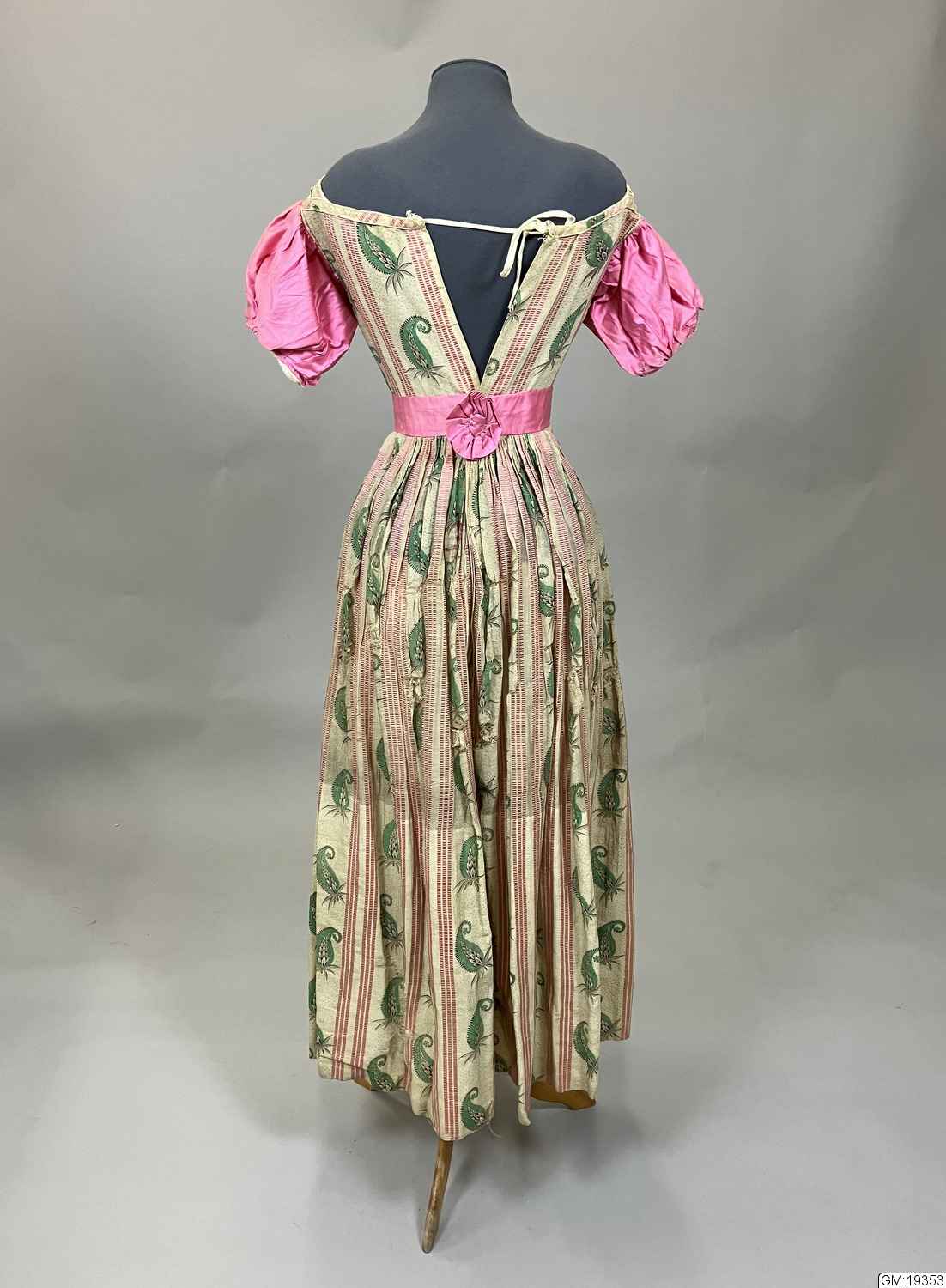 - Ärmar och skärp är i helt annan kvalité (bomullssatin) samt maskinsydda slarvigt medan klänningen i övrigt är mycket välsydd, för hand, med t.ex. passpoalerade sömmar. Den ursprungliga klänningen dateras till 1800-talets andra kvartal medan däremot ärmar och skärp bedöms vara sydda senare. Hemsymaskinen kommer först 1856 och före 1860 är symaskiner extremt sällsynta och blir vanliga först 10-20 år senare. Eventuellt kan klänningen fått nya ärmar till en maskerad eller dylikt när den var ett sedan länge omodernt plagg. /gan 990429