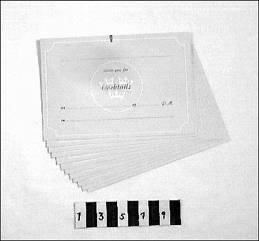 - Bunt med 12 st inbjudningskort. Korten är på framsidan ljust grå med vit rand runt kanten och tre vita kronor i en cirkel på mitten. Text: "--- invite you for Cocktails on --- at--- P.M in---." Baksidan vit.