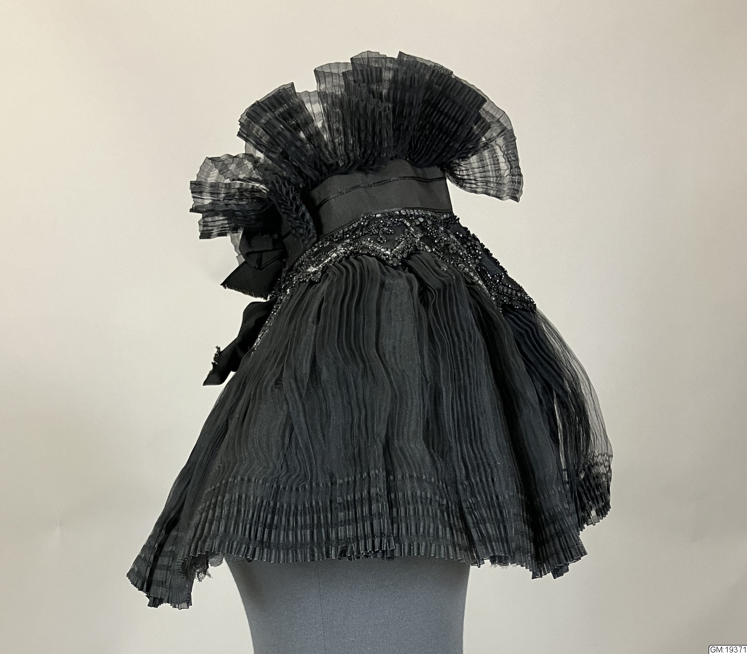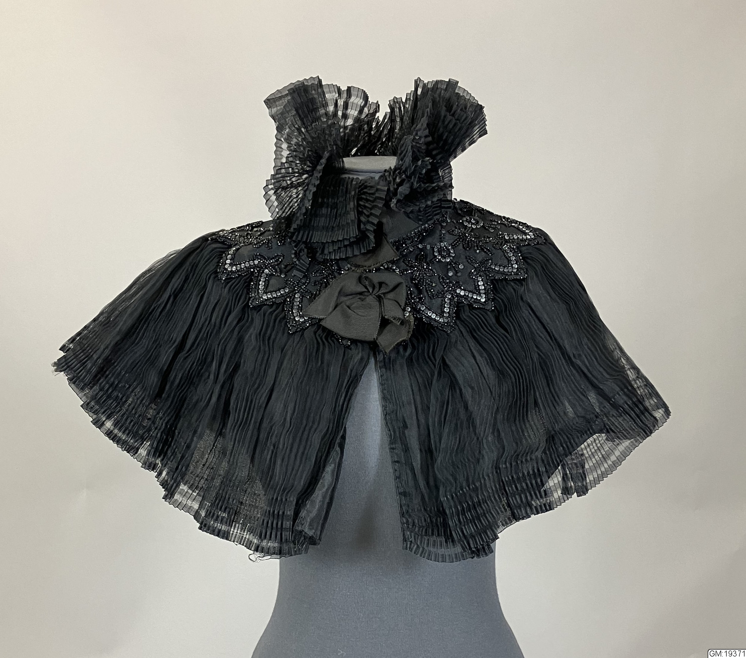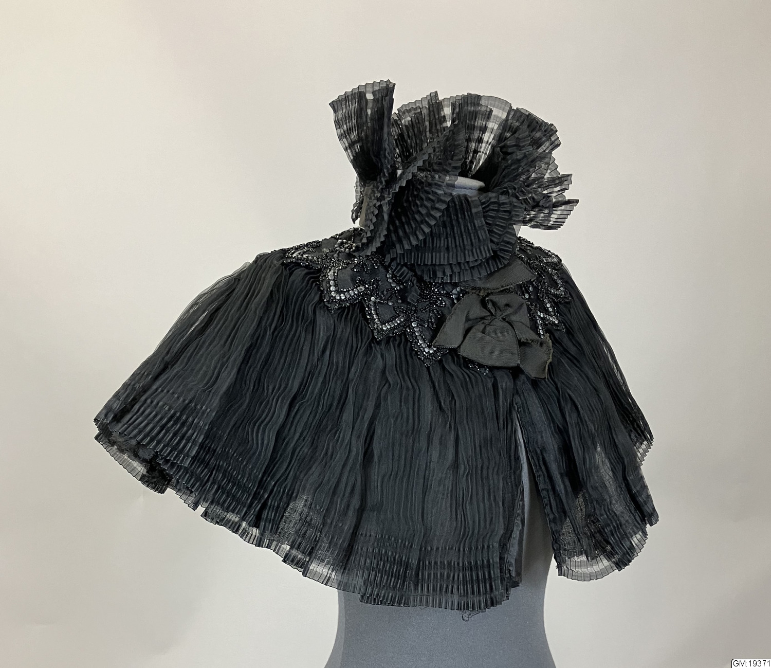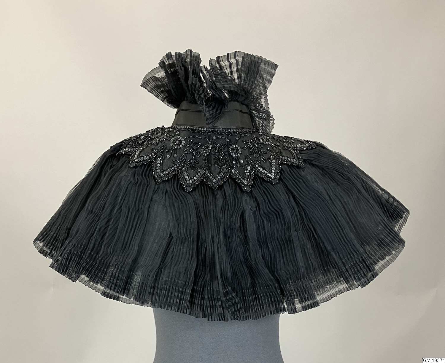 - Pellerin, krage i plisserad gaz/organza med pärlbroderi med stenkolspärlor runt axlarna. Hög plisserad krage, knäppning med hyska och hake mitt fram, rosett i halsen. Helfodrad med svart siden.