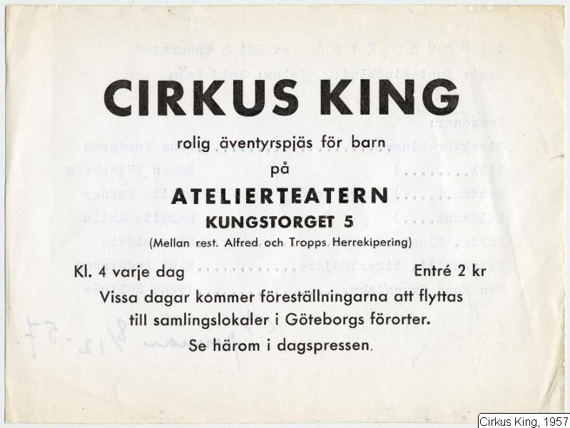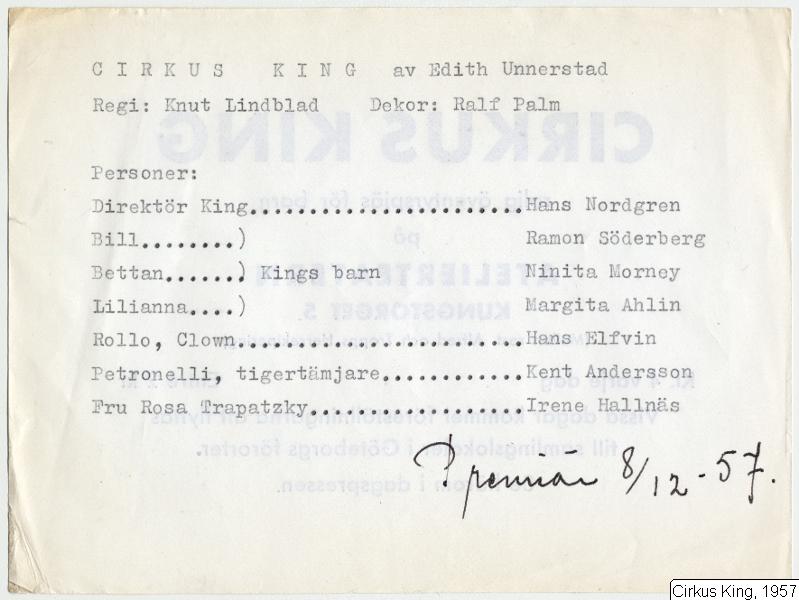 Direktör King [Nordgren, Hans]; Bill [Söderberg, Ramon]; Bettan [Morney, Ninita]; Lilianna [Ahlin, Margita]; Rollo, Clown [Elfvin, Hans]; Petronelli, tigertämjare [Andersson, Kent]; Fru Rosa Trapatzky [Hallnäs, Irene]