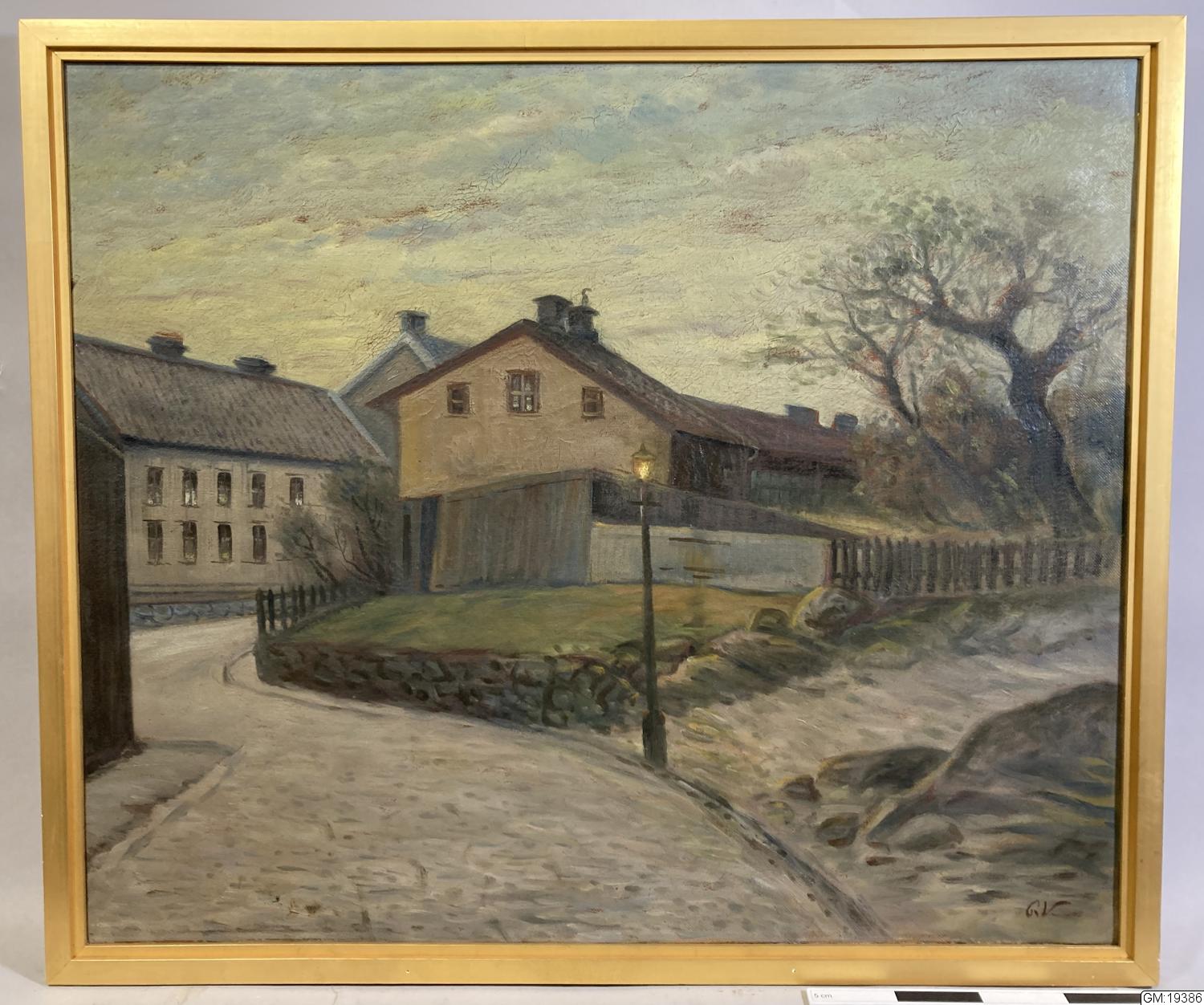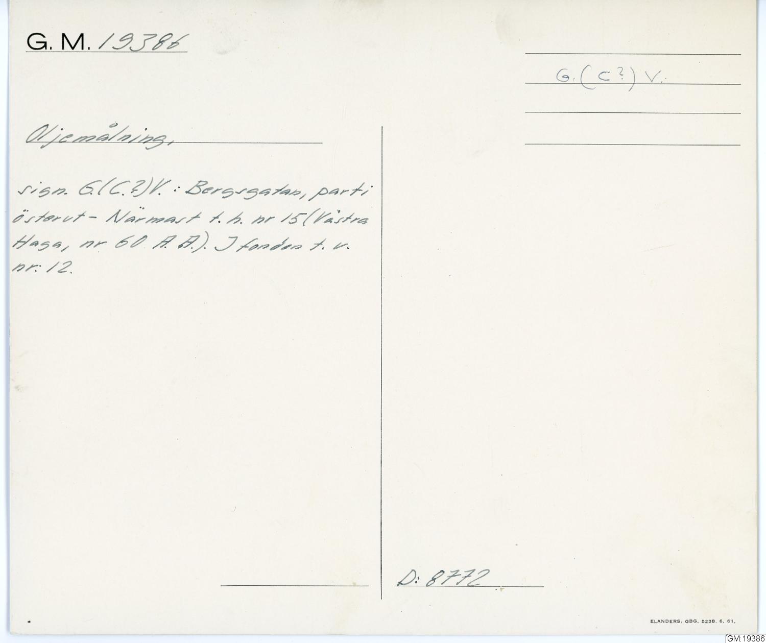 Oljemålning sign. G. (C ?) V.: Bergsgatan, parti österut. Närmast t.h. nr 15 (Västra Haga, nr 60 AA). I fonden t.v. nr 12.