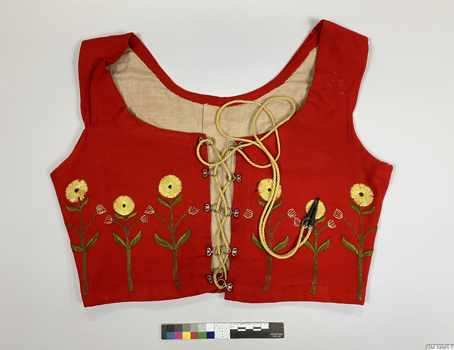 Livstycke av rött ylletyg med snörning mitt fram med gul yllesnodd med plåtkoner i ändarna. Fodrat med beige linne. Lagat på flera ställen.