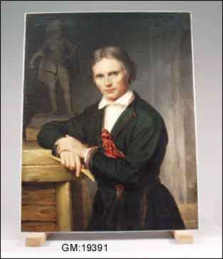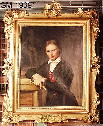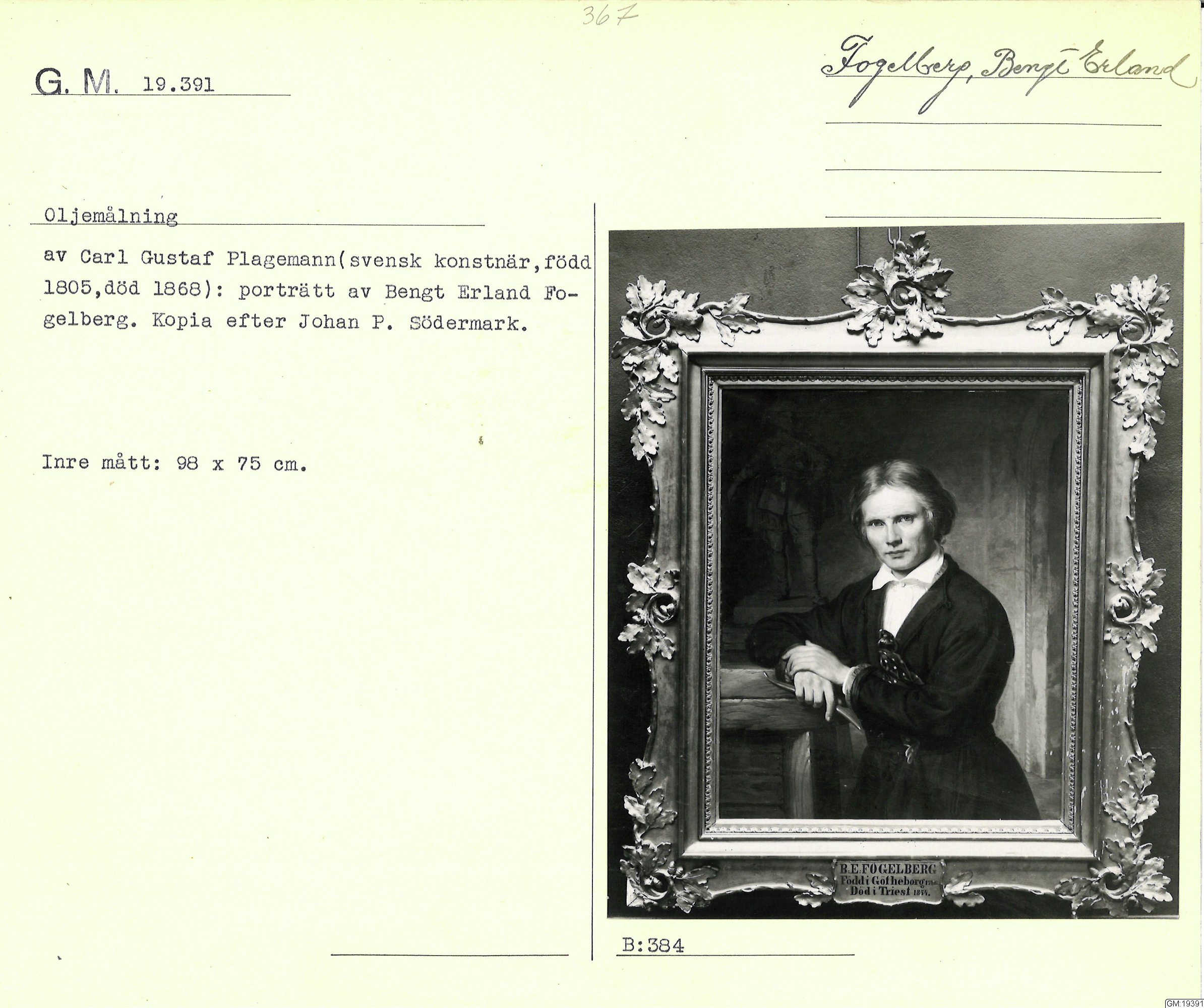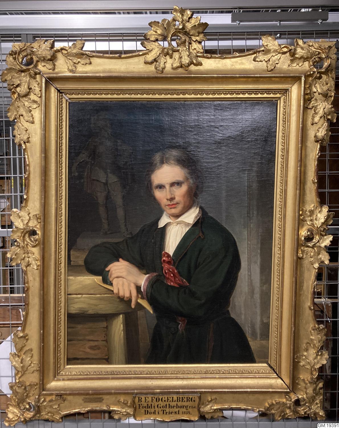 Porträtt av bildhuggaren Bengt Erland Fogelberg; kopia av Johan S Södermarks porträtt. Oljemålningen skänktes till Göteborgs museum år 1864 av kapten Peter Butenschön.