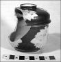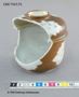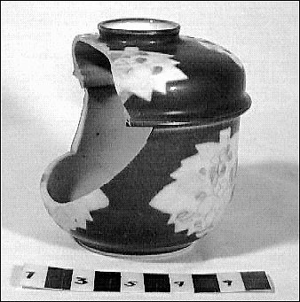 Porslinsskål (a) med lock (b), brun utsida med tre vita fält i form av löv. I dessa, en blomma. Samma färger och mönster på locket.