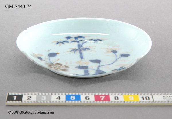 Vitt porslinsfat med ett blommande träd i brunt och blått. Lite ojämn kant. Defekt.