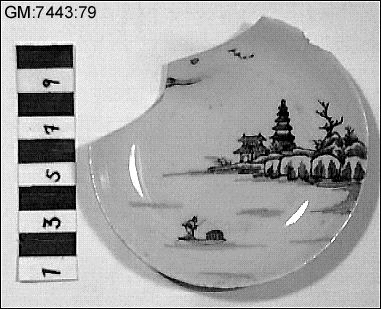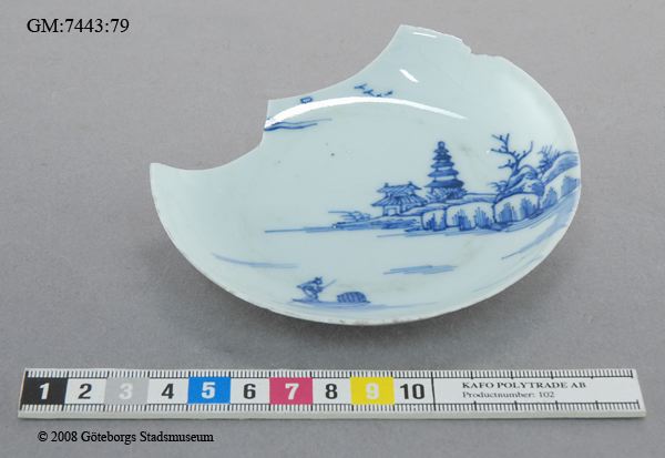Vitt porslinsfat med landskap : två hus, människa i båt, ett träd. Flygande fåglar.