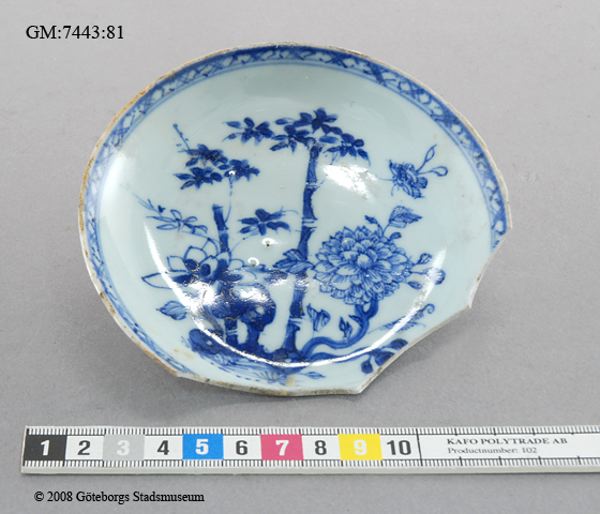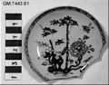 Vitt porslinsfat med blommande träd (bambu), bård med kryssmönster. ojämn kant. Defekt.