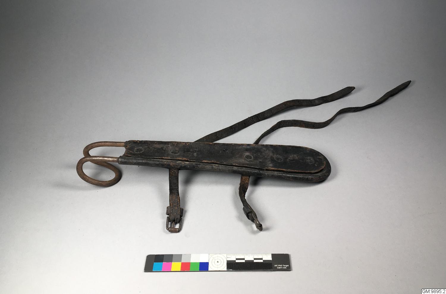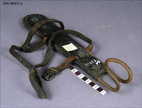 Slangkrok av läder med järnspets, 2 st läderspännen. Märkt "B 82"