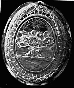 - Oval med starkt uppdrivet mittparti.Lagerkrans med rosett upptill och blomma nedtill omger det släta mittpartiet på vilket i drivet arbete en skål med bakverk omgiven av graverade bagareverktyg. Ovan skålen likaledes ingraverat inskriften: Niclas Holm d 6 Sept 1822#På baksidan följande stämplar#förfärdigad 1822 av guldsmeden i Göteborg Johan Malmstedt ( 1783-1831 )