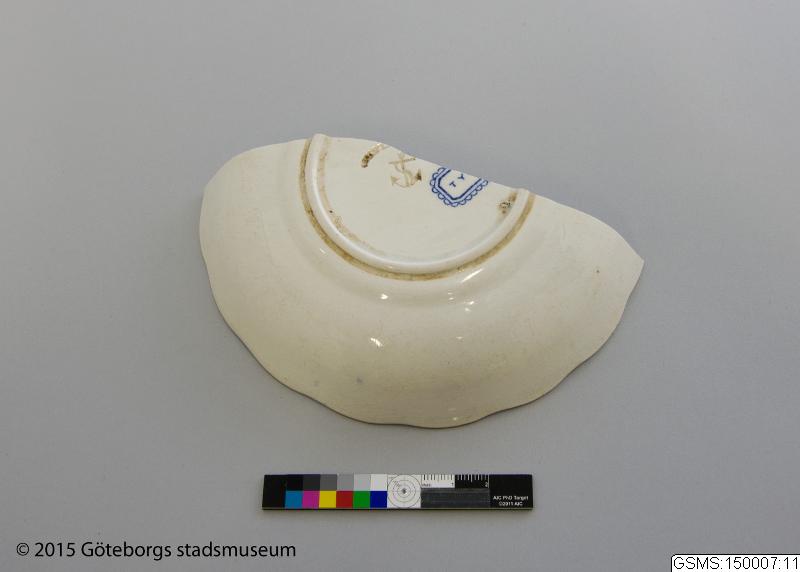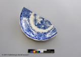 Halvt fat i flintgods från Gustafsberg. Blåvitt landskapsmotiv "Tyrol".