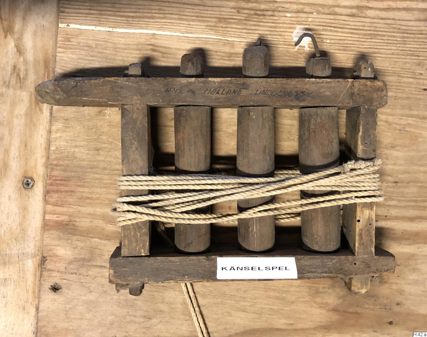 - Repslageriverktyg. "Känsespel". I en ram sitter tre axlar, som drivas runt genom ett större, vilket löper runt axlarna i utskurna skåror. Redskapet användes till att sno tafsar till långreven med. Krokar finnas dock enbart i två av de tre axlarnas ändar.