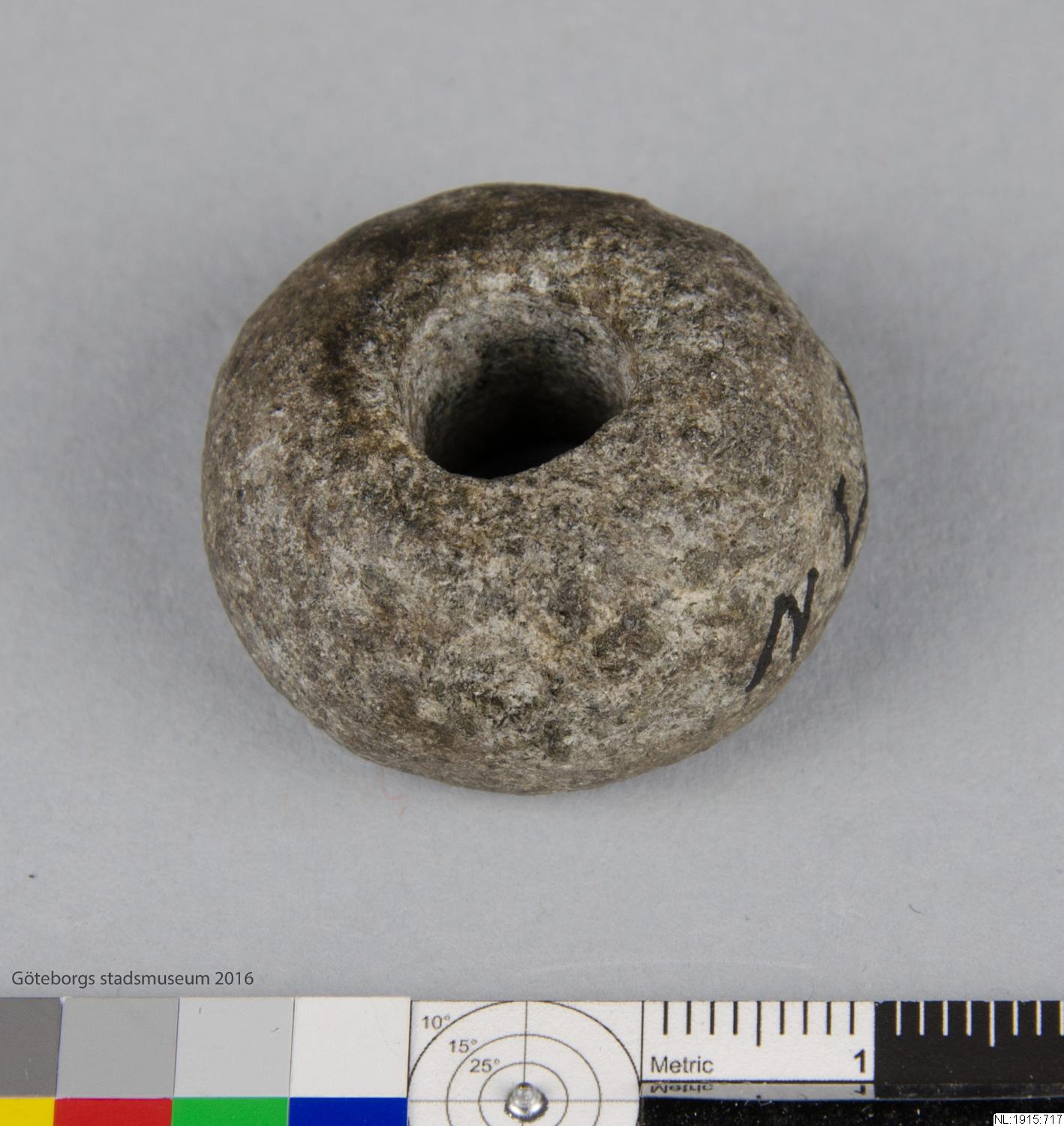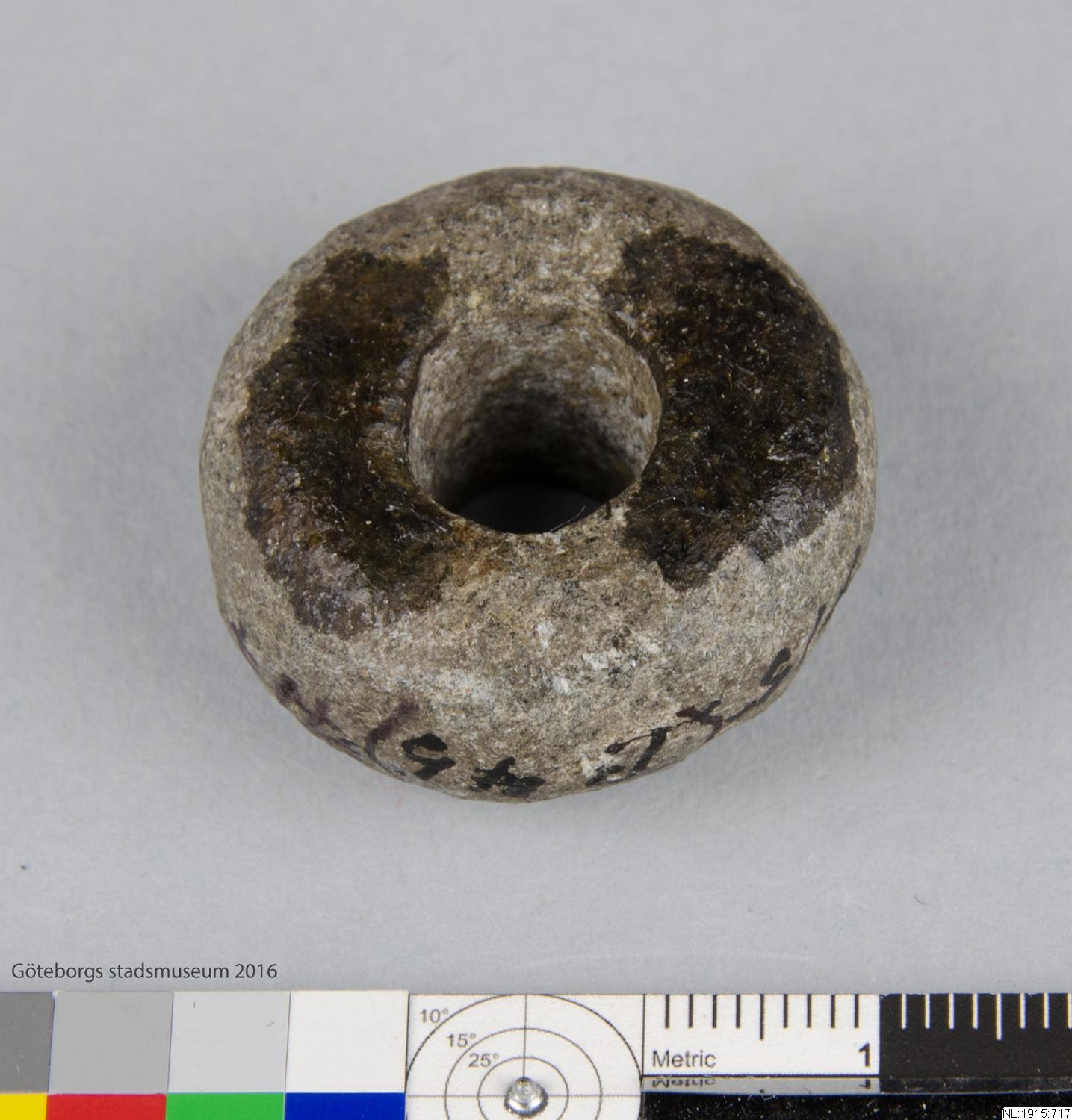 I kistan: Sländtrissa av täljsten, från Nya Lödöse. Sländtrissan sitter som tyngd på den snurrande sländan, som tvinnar ullen till garn. (NL:1915:717) [Göteborgs födelse, 2017]