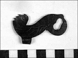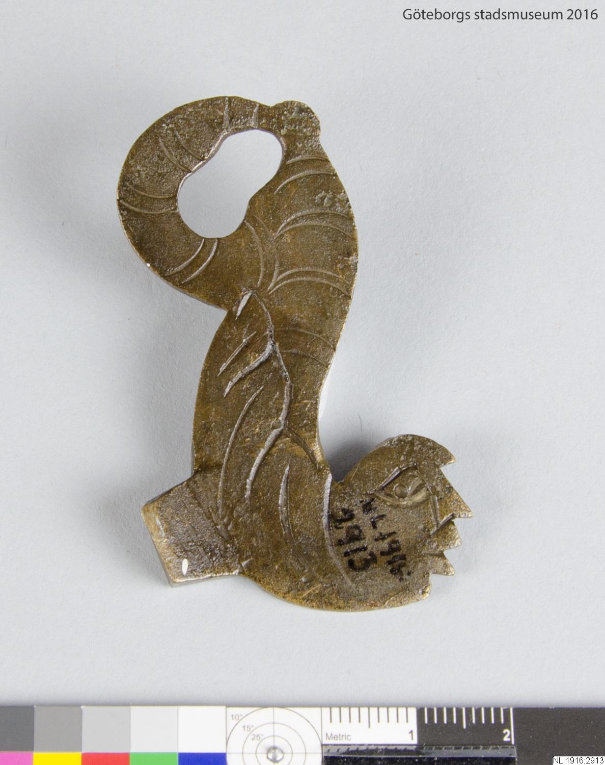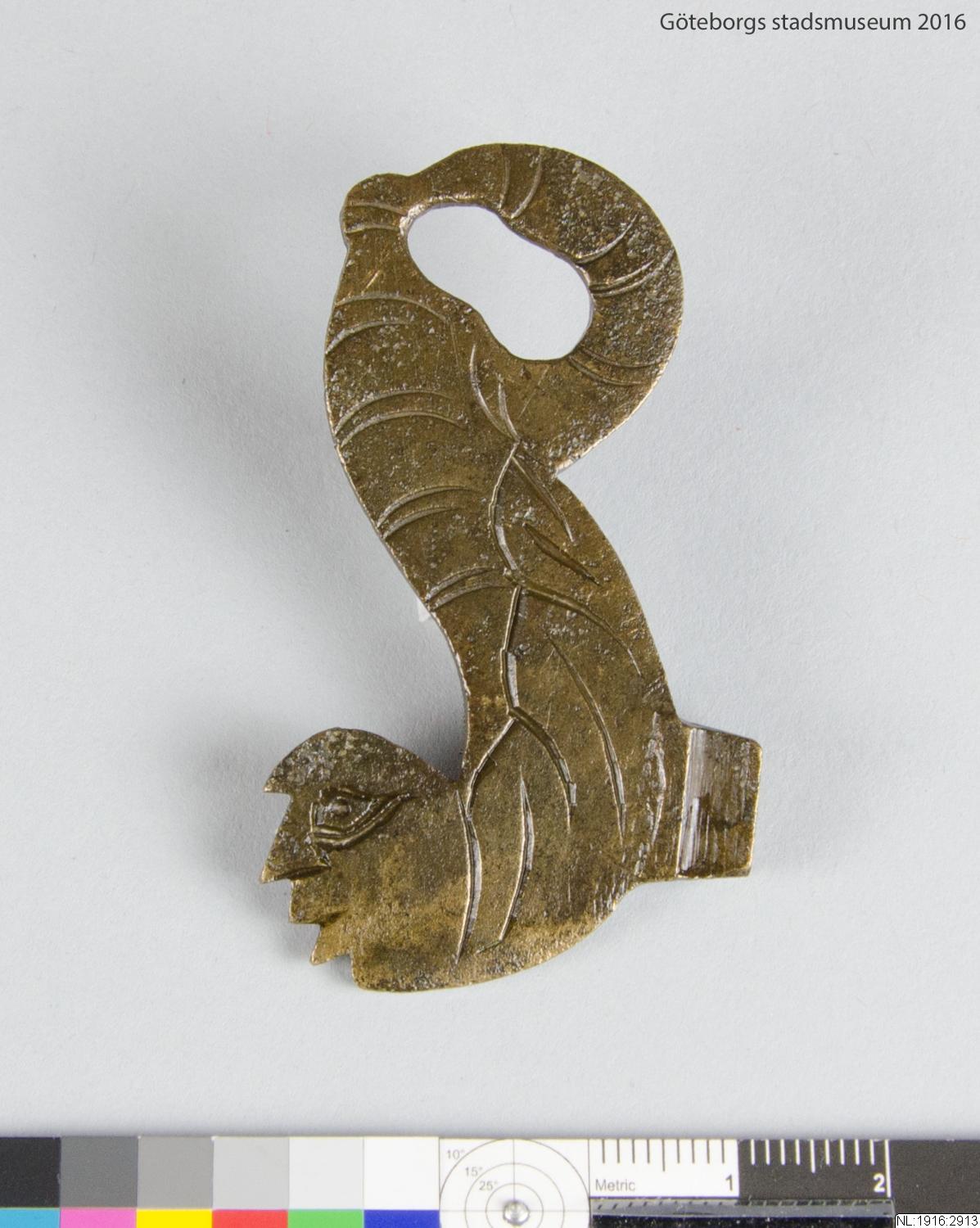 En del till ljuskrona. Av mässing med ingraverade ornament. Fynd från Nya Lödöse.
