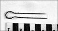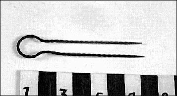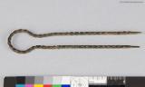 Hårnål i mässing, av en tråd, spiralvriden. Rundad överdel med parallella ben.