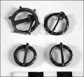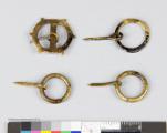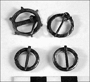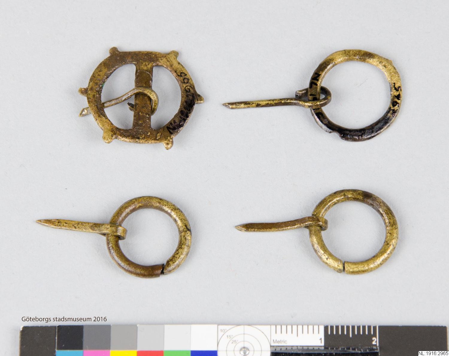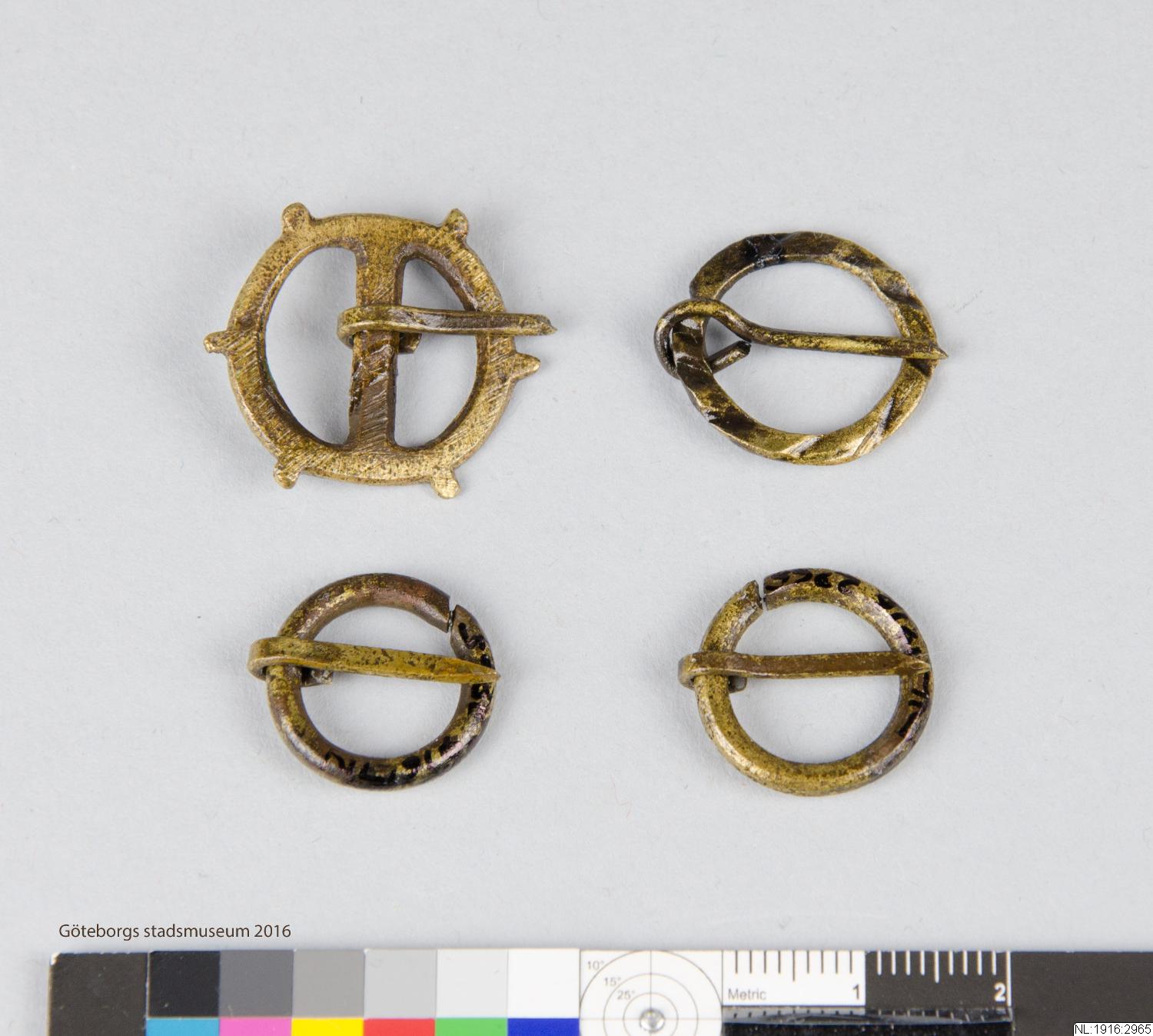 Runda spännen (söljor) i mässing, gjutna. Den största har mittslå med nål. Sex dekorativa piggar runt kanten. De tre övriga är enkla runda utan mittslå, nålen fäst runt kanten. En har en diam om 1,8 cm och dekor. De båda återstående är runda slät och mäter 1,7 cm diam.