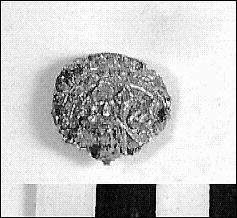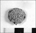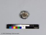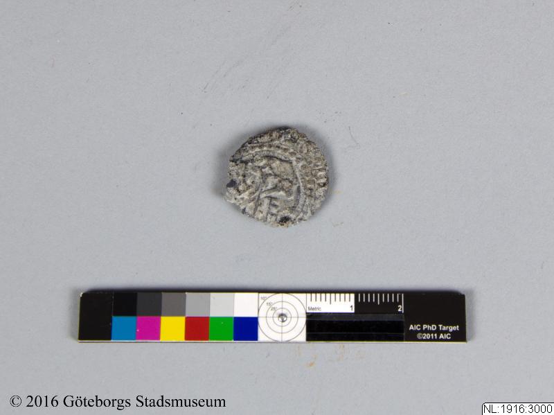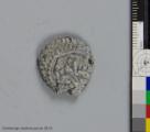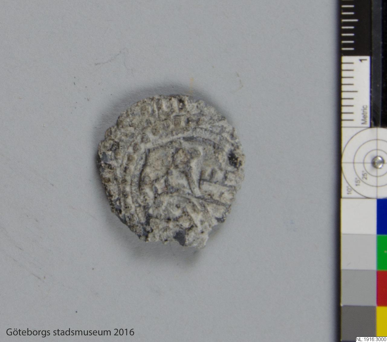 Plomb, del av. En gjuten blyplatta med stadsvapen, (? från Bremen) med två korslagda nycklar. Text runt kanten, oläsligt, då plomben är skadad. På baksidan upphöjning som ska passa hål i den saknade delen. Ömtålig.