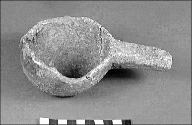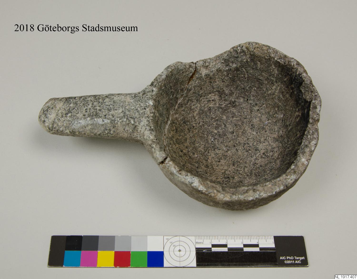 - En sk handtagsakarott av täljsten. Två sammanfogade skärvor. Fynd från Nya Lödöse 1917.