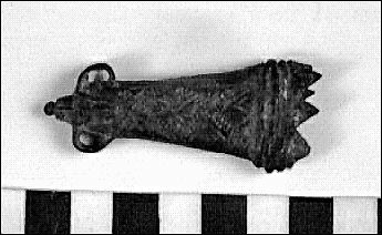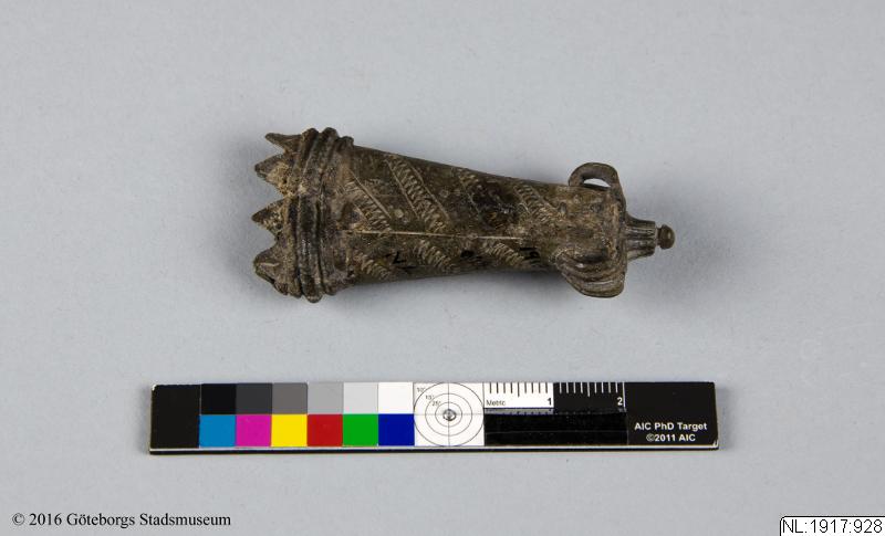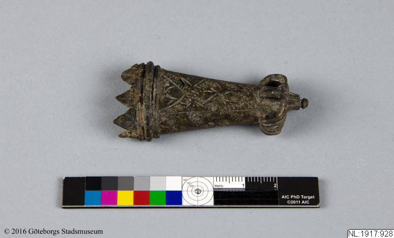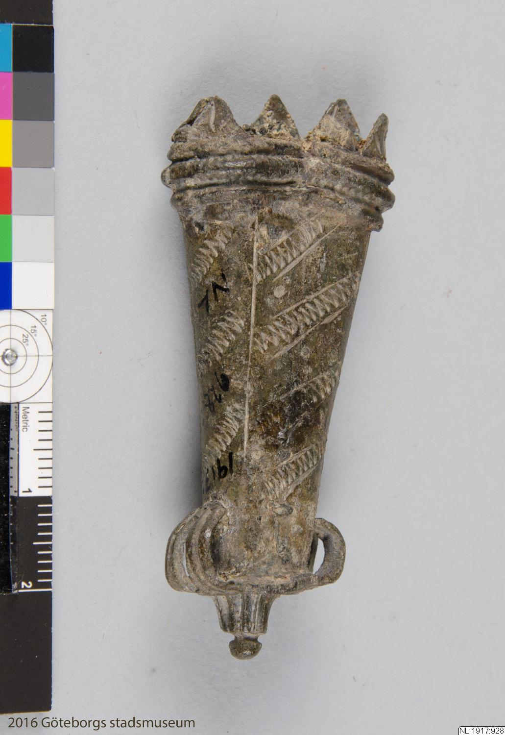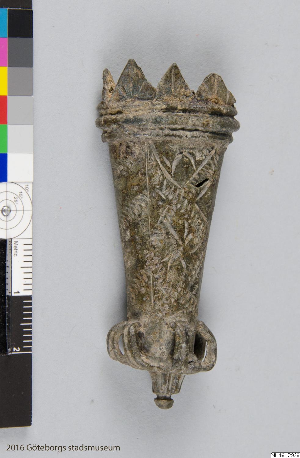 - En doppsko av bly, med ingraverad ornamentik. Fynd från Nya Lödöse.