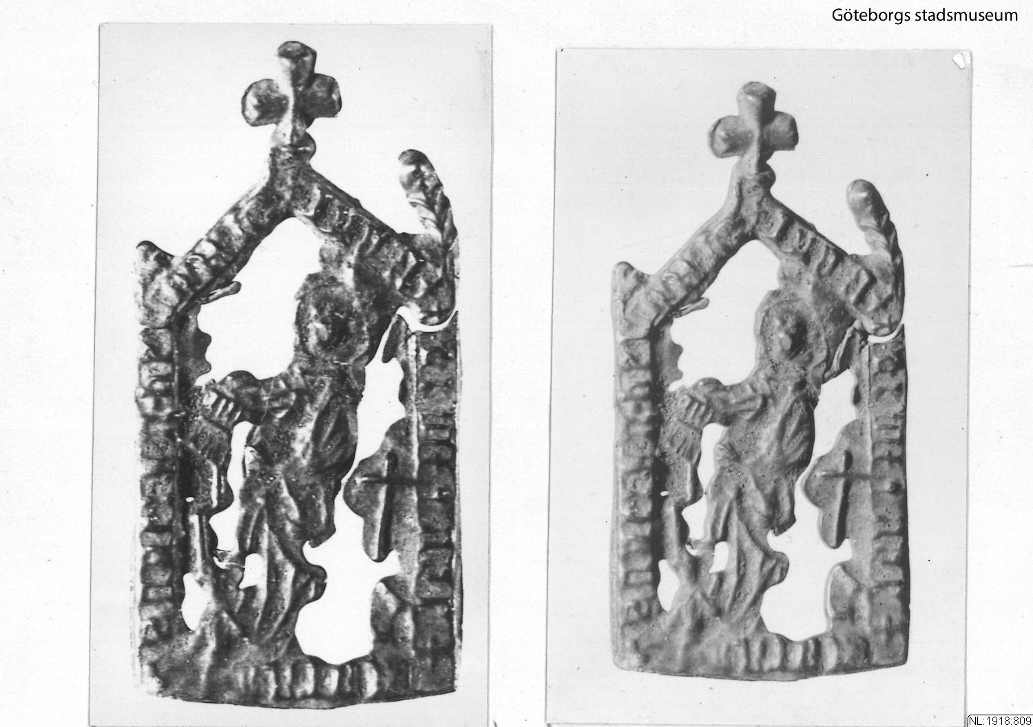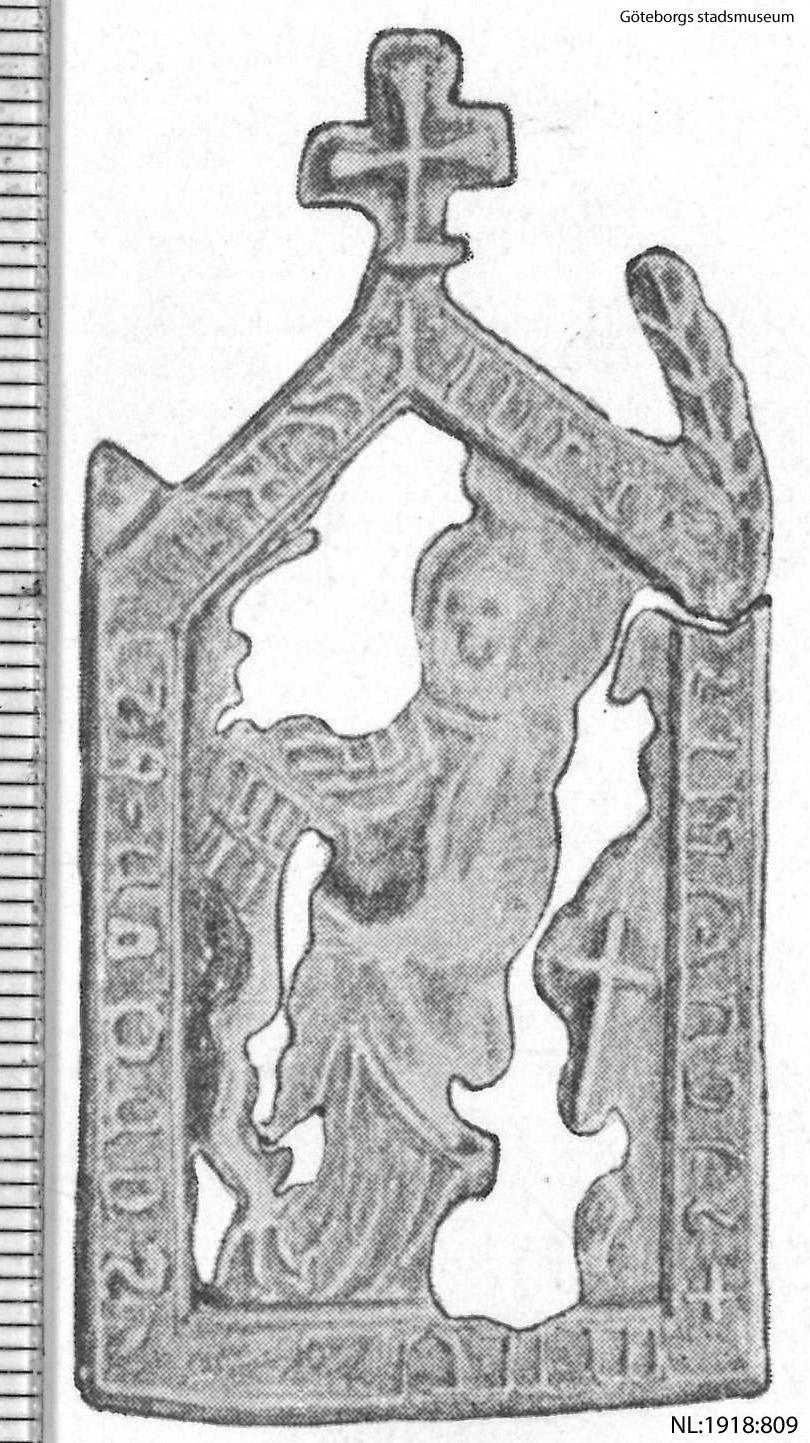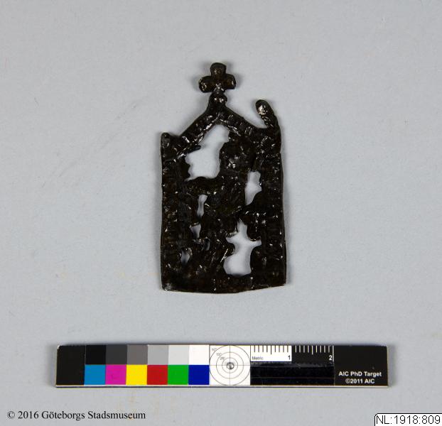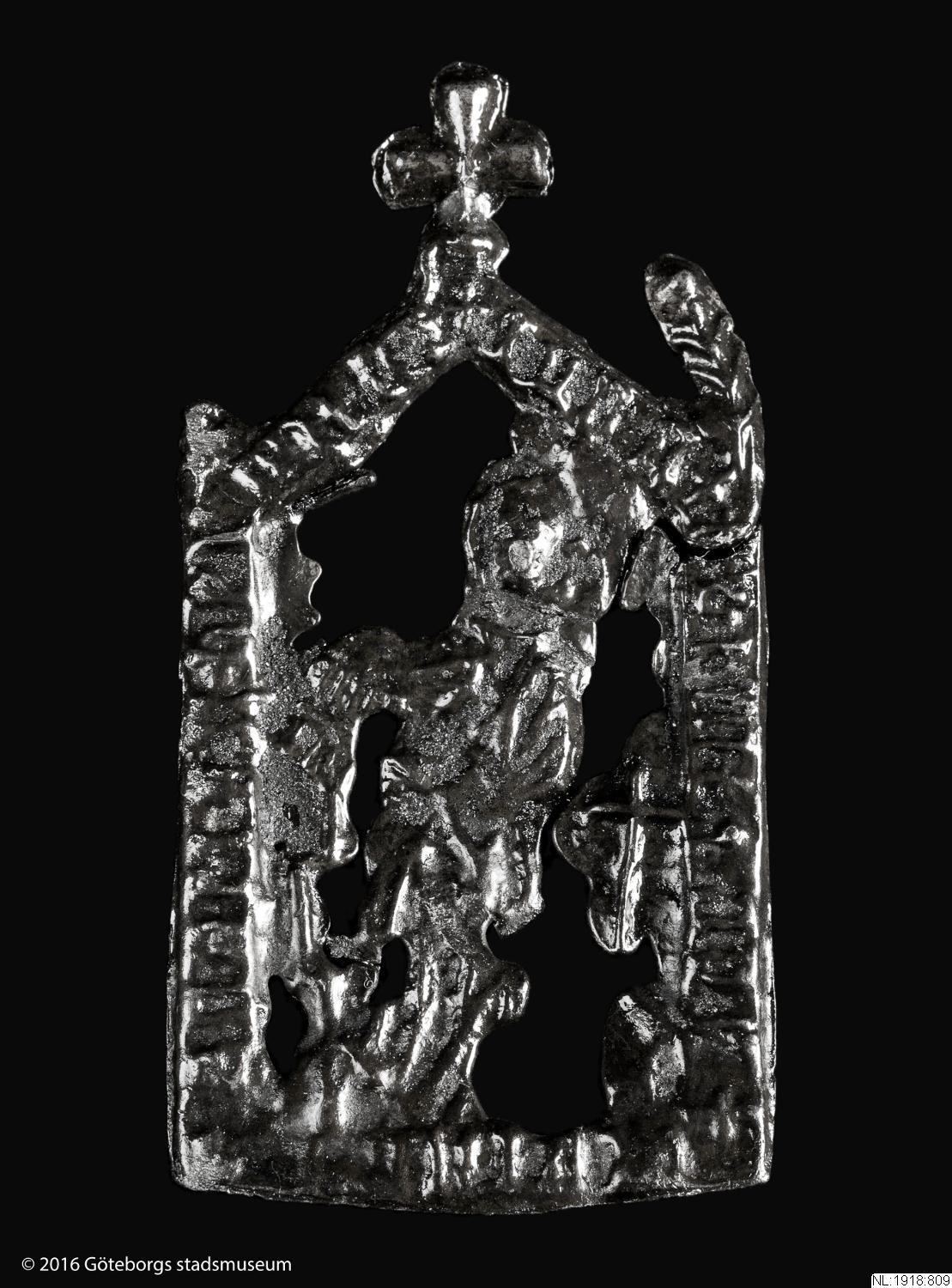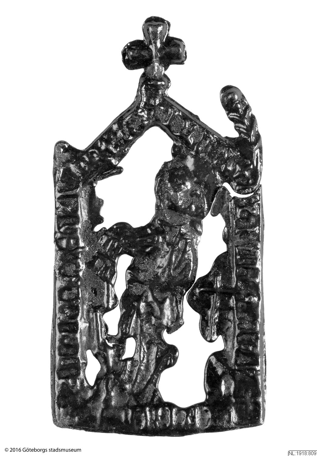 Pilgrimsmärke från Vadstena, som föreställer den heliga Birgitta. Hittad i Nya Lödöse. (NL:1918:809) [Göteborgs födelse, 2017]