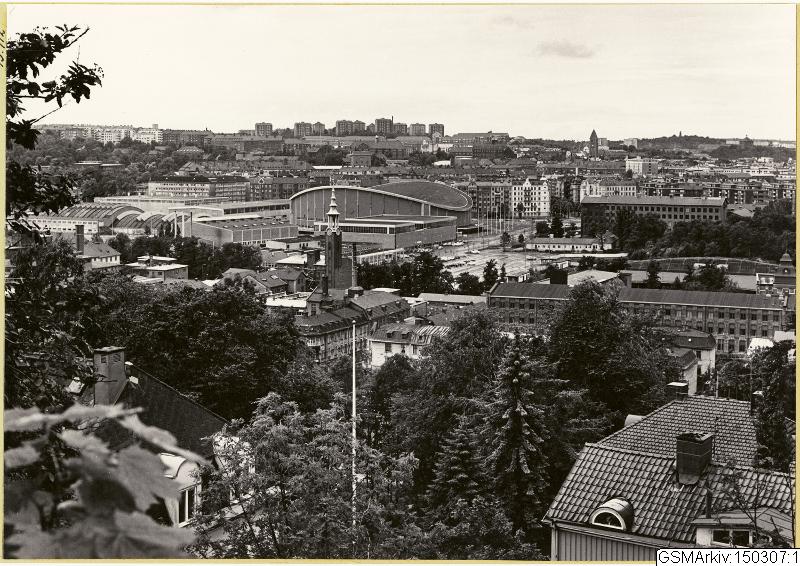 Fotot taget från Örgryte över Gårda mot Johanneberg i fonden. Mellan Scandinavium och klocktornet på före detta Tomtens fabriker syns Valhallabadet.