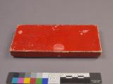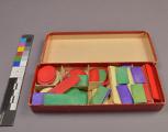 Röd pappask med spelbrickor i rött, grönt, lila och vitt, i 3 olika former: