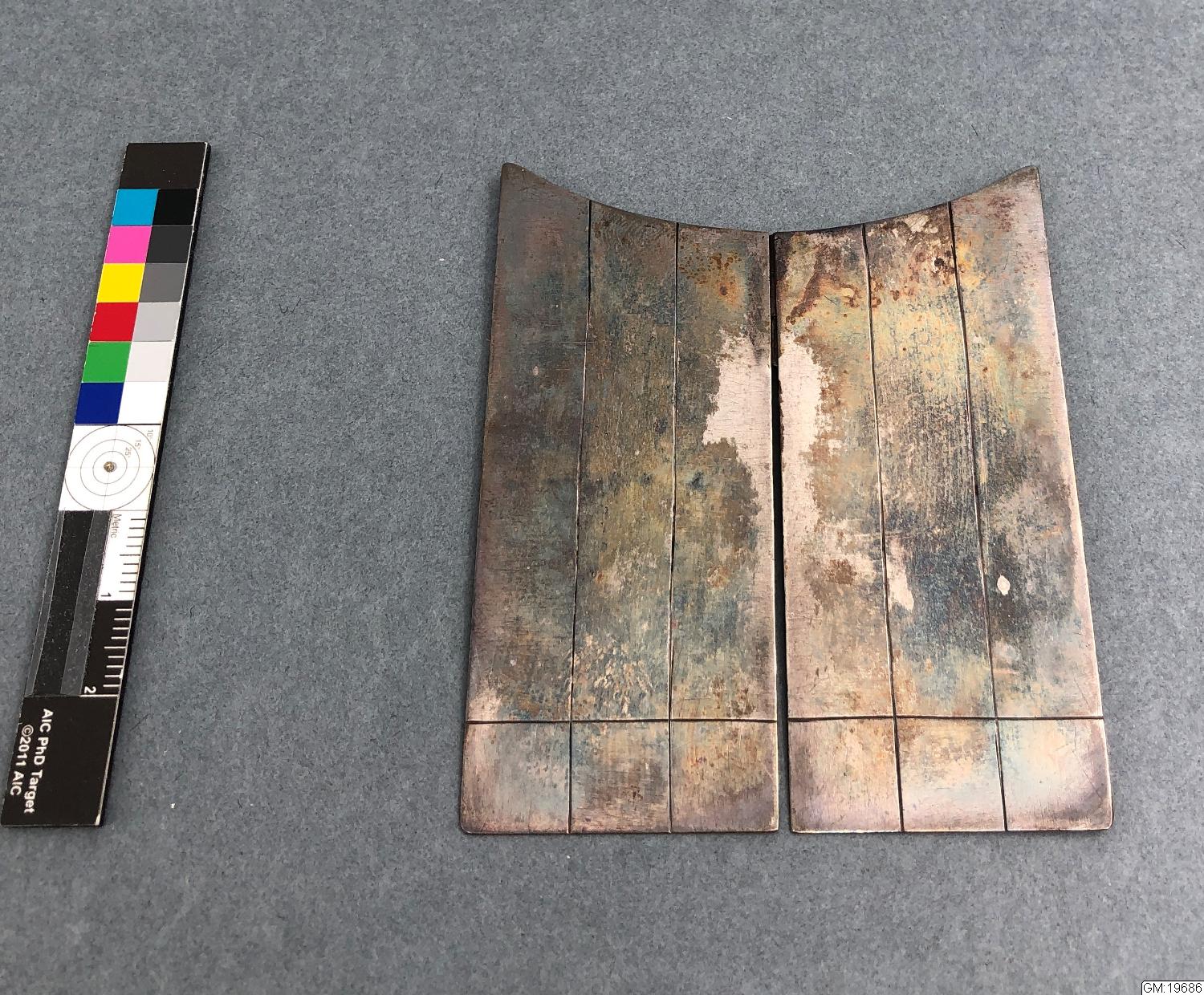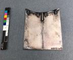 Prästkrage a silver, ledande på ett gångjärn. Framsidan dekorerad med ingraverade linjer, sömmar. Stämplar: Q4, G, tre kronor och CT = 1846, Carl Tengstedt, Göteborg.