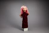 - Handdocka föreställande en flicka med enkel hellång klänning i vinröd syntetsammet. Händer och huvud är stoppade klädda med bomullstrikå och sedan ytbahandlad med ljusbeige/rosa hudfärg. Ansiktet saknar mun och näsa men har ögon bestående av blomformade plastknappar med vita kronblad och brunröd pistill. Dockan har långt hår av garnkvalitér i syntet i vitt och olika rosa nyanser. På huvudet sitter en "krona" bestående av en krokig trädgren prydd i toppen av en liten hängande genomskinlig vinkelslipad plastpärla.