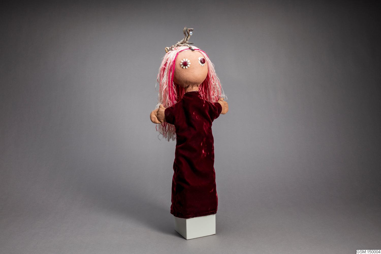 - Handdocka föreställande en flicka med enkel hellång klänning i vinröd syntetsammet. Händer och huvud är stoppade klädda med bomullstrikå och sedan ytbahandlad med ljusbeige/rosa hudfärg. Ansiktet saknar mun och näsa men har ögon bestående av blomformade plastknappar med vita kronblad och brunröd pistill. Dockan har långt hår av garnkvalitér i syntet i vitt och olika rosa nyanser. På huvudet sitter en "krona" bestående av en krokig trädgren prydd i toppen av en liten hängande genomskinlig vinkelslipad plastpärla.