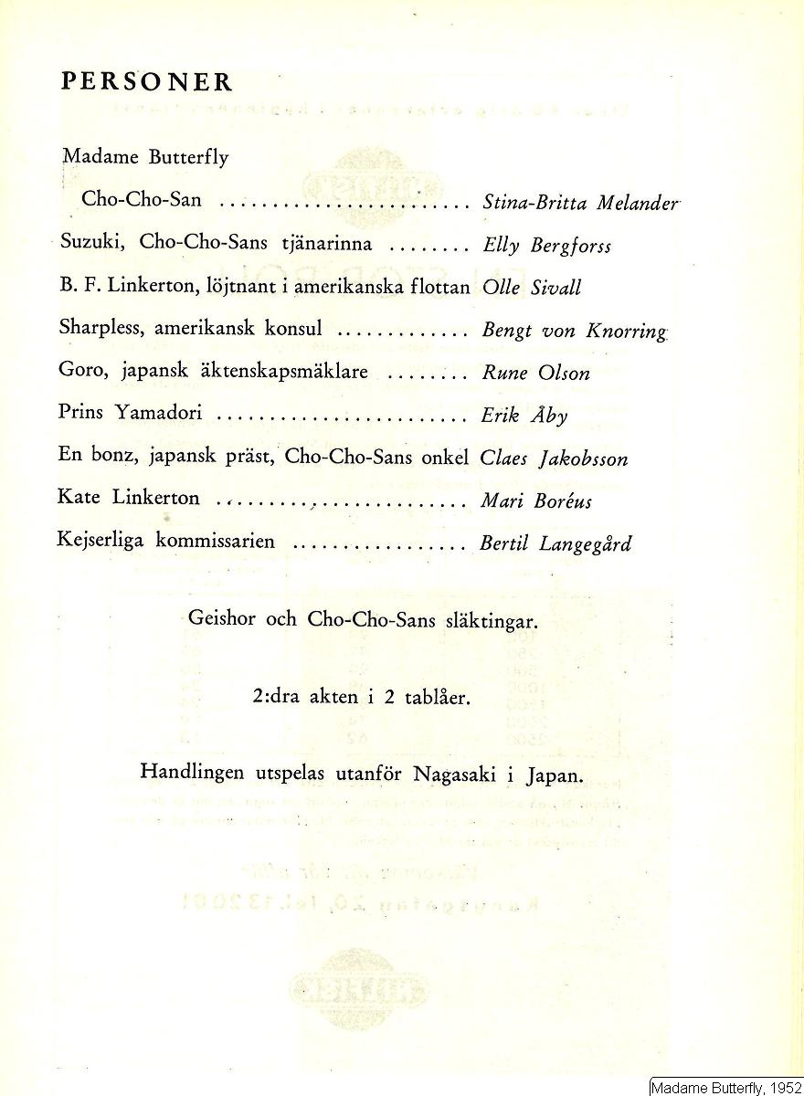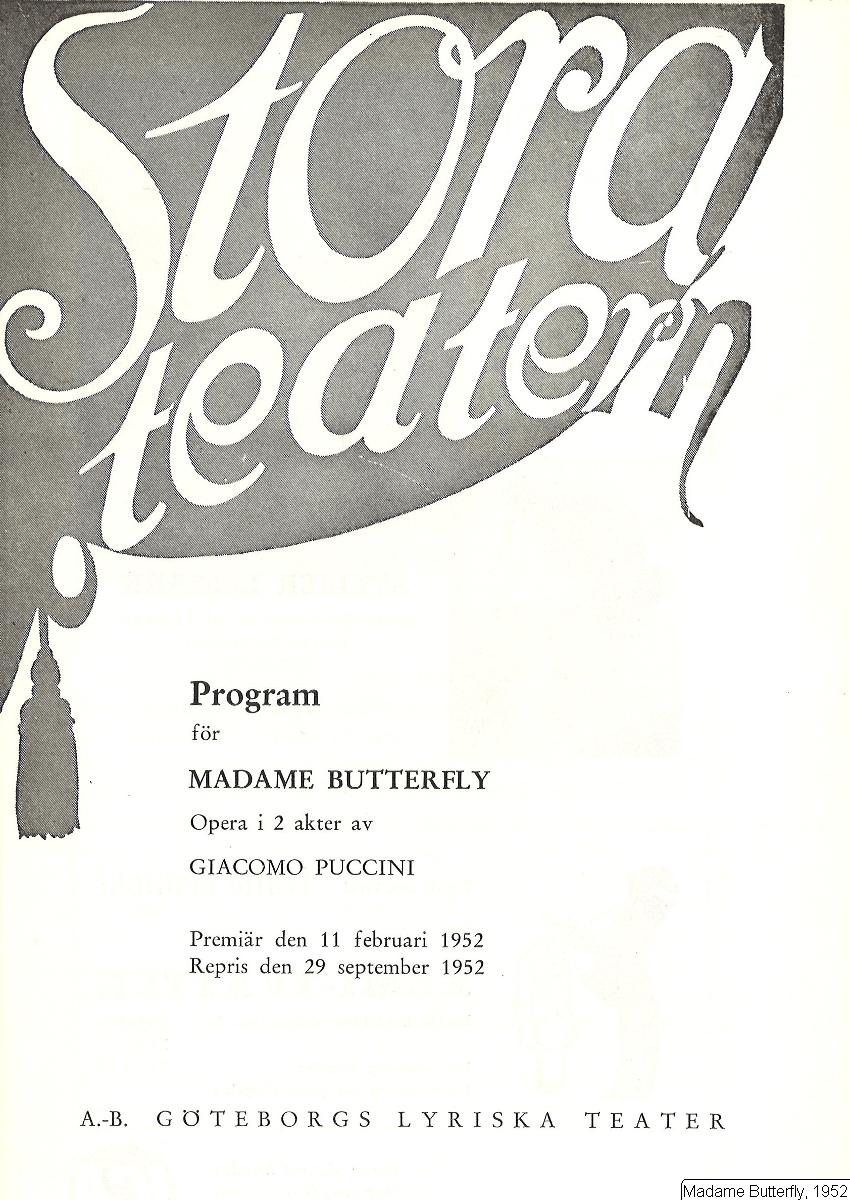 Italiensk opera i 3 akter från 1904 av Giacomo Puccini med libretto av Luigi Illica och Giuseppe Giacosa, baserad på en novell av John Luther Long.; Uppsättningen spelad 11 ggr (prem) + 4 ggr (repris).