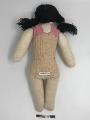 Det här var den andra dockan givaren fick från farmor.Trasdocka sydd av givarens farmor, anletsdragen är broderade och dockan har flätor av garn. dockan har stickat linne och strumpor som sytts samman i strumpornas överkant och linnets nederkant. Enligt givaren fanns det mer kläder till dockan när givaren var barn. Dessa dock-kläder kan hon inte hitta.
