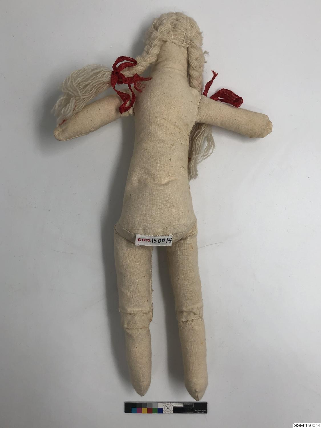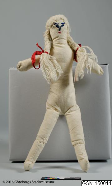 - trasdocka sydd av givarens farmor, dockan har broderade anletsdrag och flätor av garn. Enligt givaren fanns det kläder till dockan när givaren var barn. Dessa dock-kläder kan hon inte hitta.Detta var den tredje dockan givaren fick av sin farmor på 1950 talet.