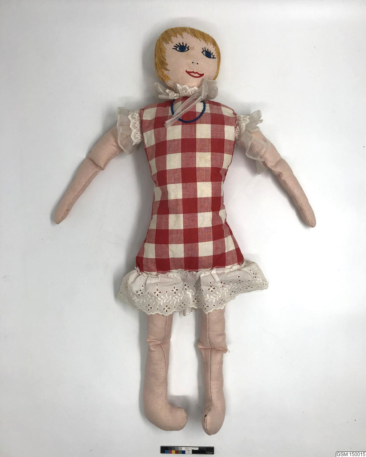 trasdocka sydd av givarens farmor. Detta var den sista dockan givaren fick av sin farmor, när hon fick den på 1960 talet var hon "lite för stor att leka med dockor" så den här dockan var mer ett prydnadsföremål än en leksak. Anletsdragen och håret är broderade dockan har också ett broderat blått halsband.Torson är sydd av rödrutigt tyg och ser på så vis ut som en rutig klänning med spetskjol och spetsärmar och krage.