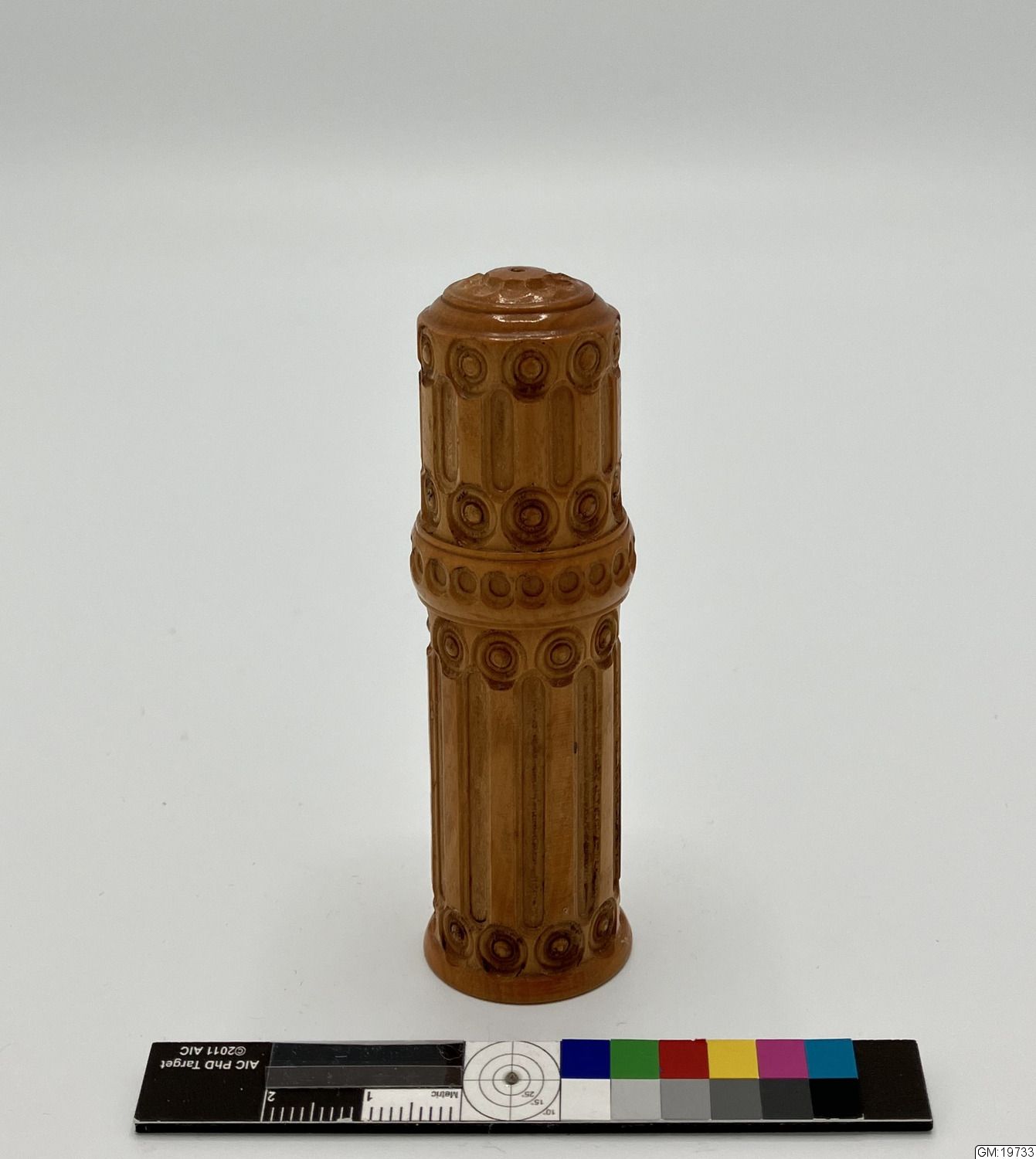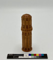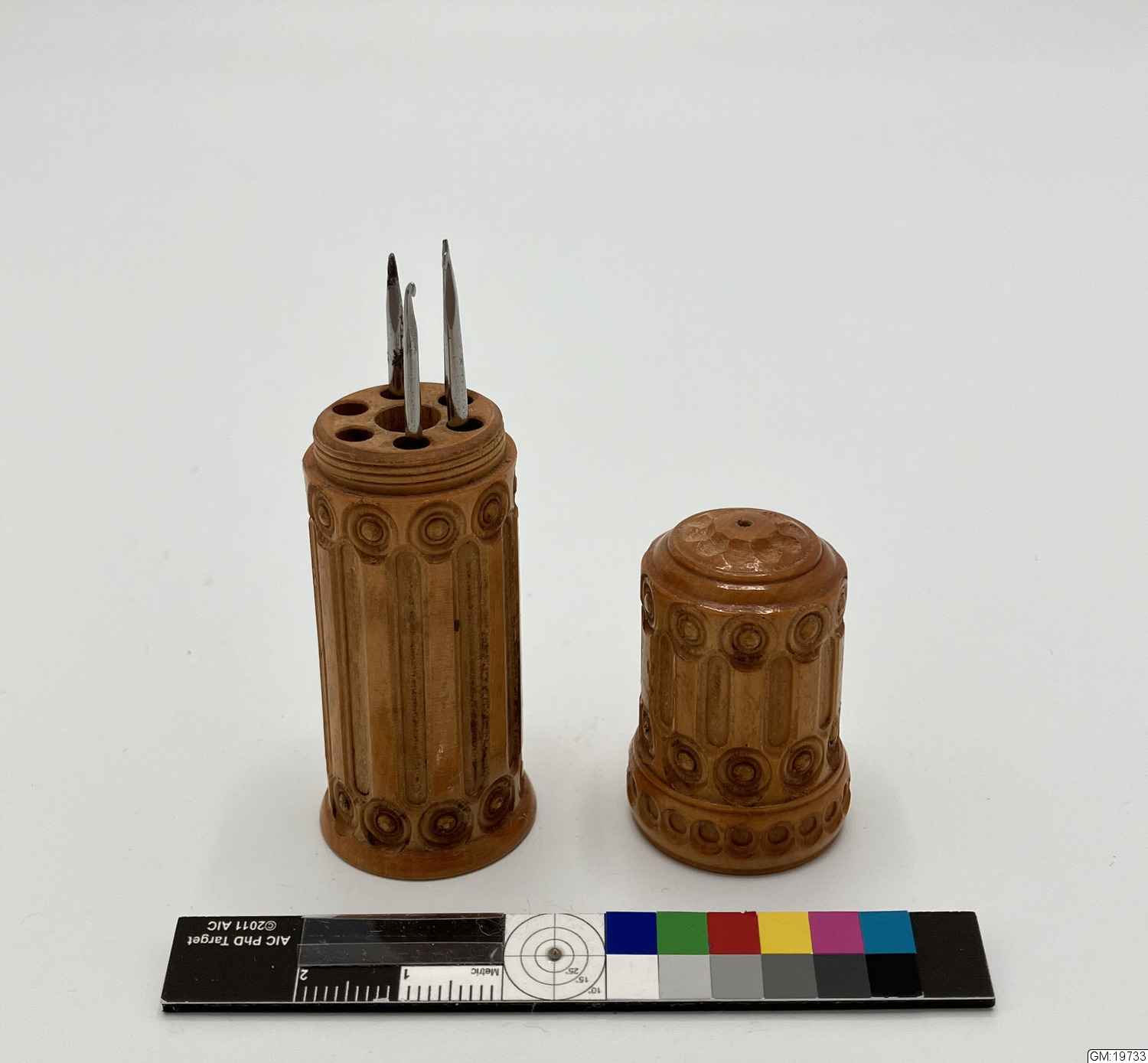 - Cylindriskt etui för virknålar, av trä med relieffdekor som troligen är snidad. Inuti är hål för sex virknålshuvuden och ett skaft. Virknålshuvudena är av olika små storlekar och kan fästas i det blanka metallskaftet med gängor.